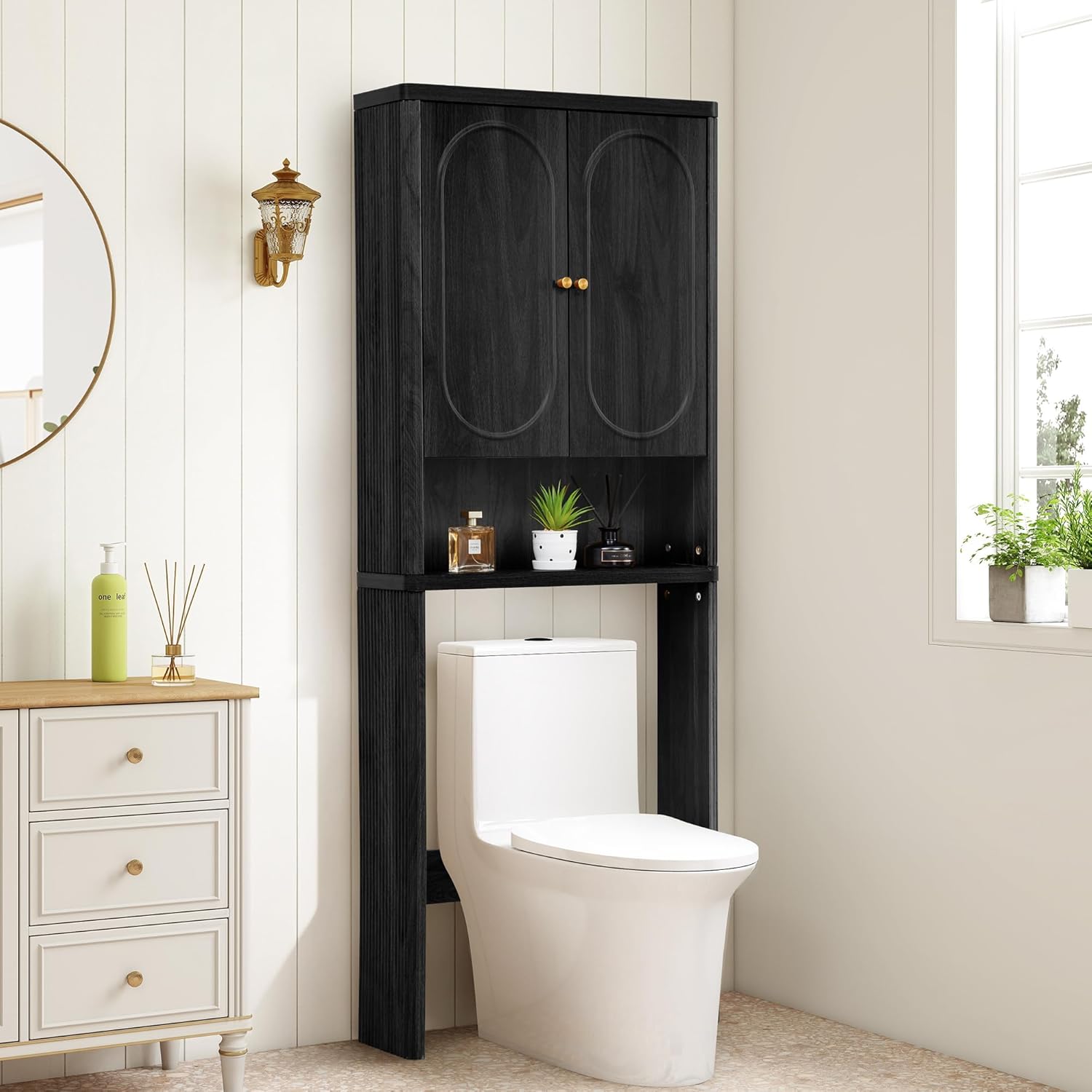 Fluted Over The Toilet Storage Cabinet, Bathroom Toilet Storage Cabinet with Door, Wood Curved Over The Toilet Space Saver Cabinets for Restroom Bathroom, Black
