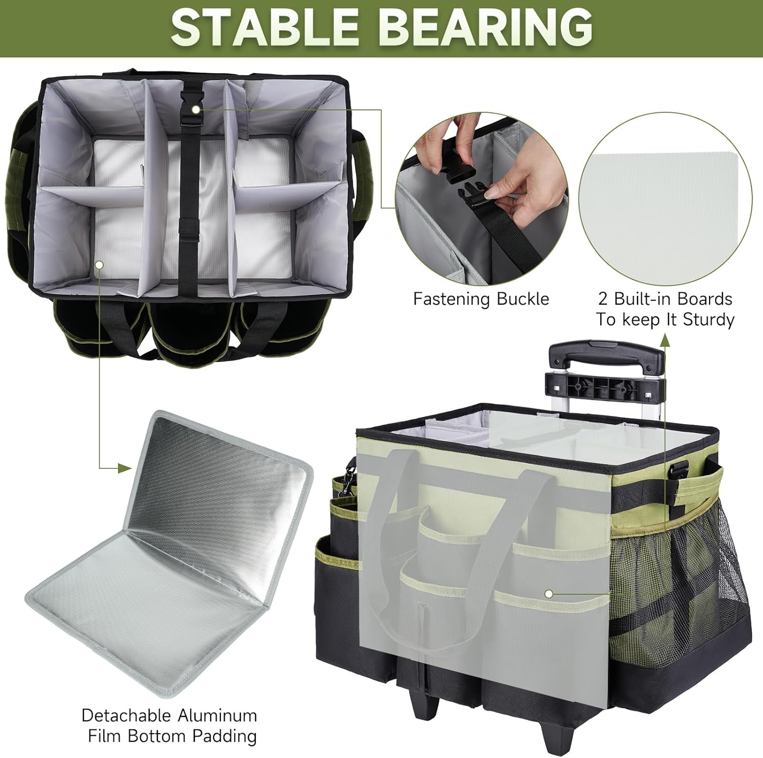 - Strong Load-bearing:The cleaning cart on wheels is made of water resistant material with built-in boards on the front and back sides to keep the cleaning caddy bag in shape. The bottom has a removable aluminum film bottom pad for easy cleaning. There is a fastening buckle that prevents it from collapsing or tilting when filled with cleaning tools
