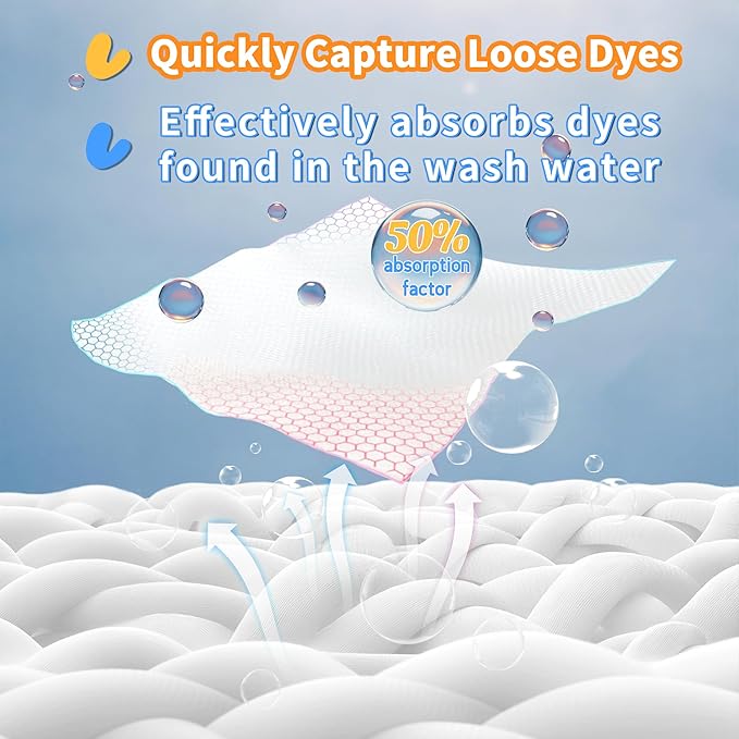 - 【Guaranteed Color Protection & Effortless Sorting】 Say goodbye to sorting lights and darks! Simply toss in one of our color catcher sheets with every mixed load. These innovative color grabber sheets actively absorb and trap loose dyes in the water, preventing them from redepositing on other fabrics. This means you can wash more clothes together, saving significant time, water, and energy on laundry day.
