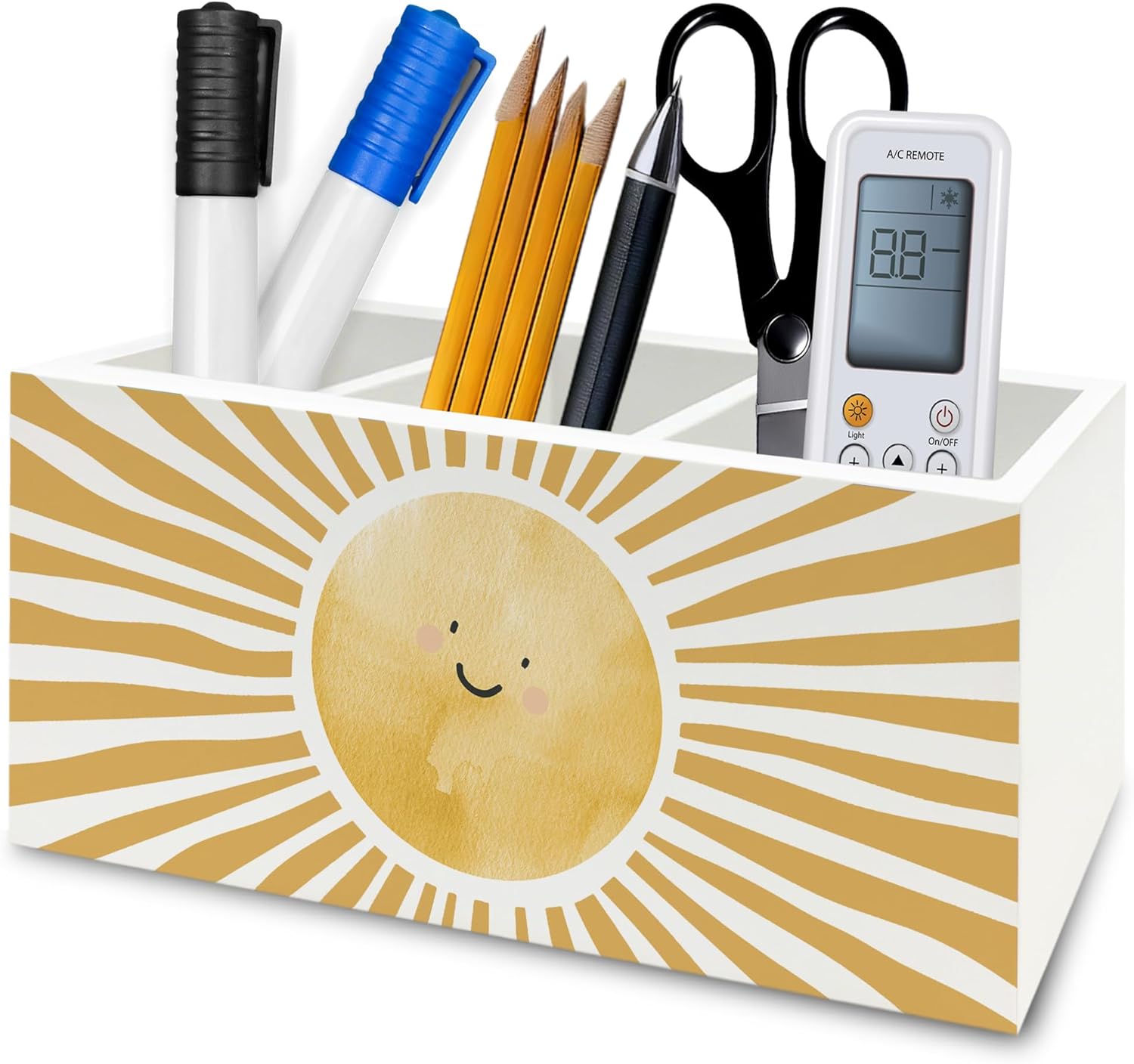 Boho Yellow Sunshine Pen Pencil Holder Organizer for Desk, Cute Smile Groovy Sun Sunshine Wooden Box Signs Decorations for Kids Room Home Classroom Desk Tabletop