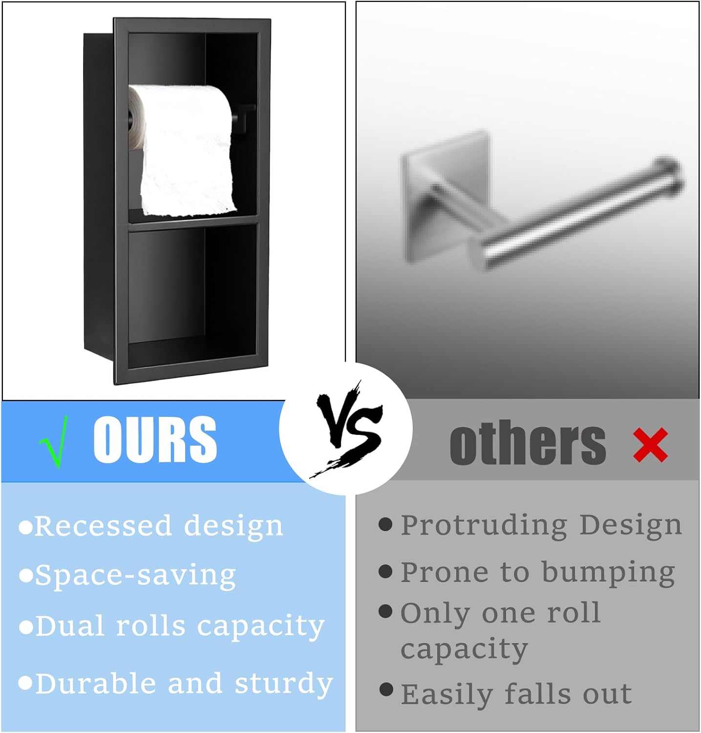 - DURABLE AND STYLISH: Crafted from premium stainless steel, this recessed toilet paper holder offers exceptional corrosion resistance and long-lasting durability. Its waterproof design makes it ideal for modern bathroom decor and humid environments.