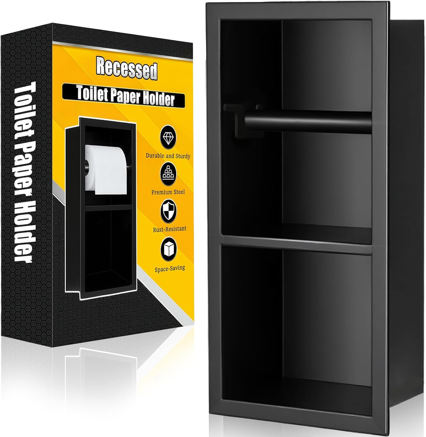 Recessed Toilet Paper Holder, Matte Black Toilet Paper Roll Holder Built-in Bathroom Tissue Roll Holder with Storage, Stainless Steel,Rust-Proof and Space-Saving