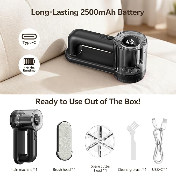 - Long-Lasting 2000mAh Battery & Modern Type-C Charging: Powered by a high-capacity 2000mAh lithium-ion battery, this cordless fabric shaver delivers an exceptional 4-6 hours of continuous runtime on a full charge. The universal USB Type-C charging port ensures fast, convenient, and reversible plug-in recharging using your laptop, power bank, or phone adapter. Enjoy unparalleled portability and uninterrupted fabric care sessions.