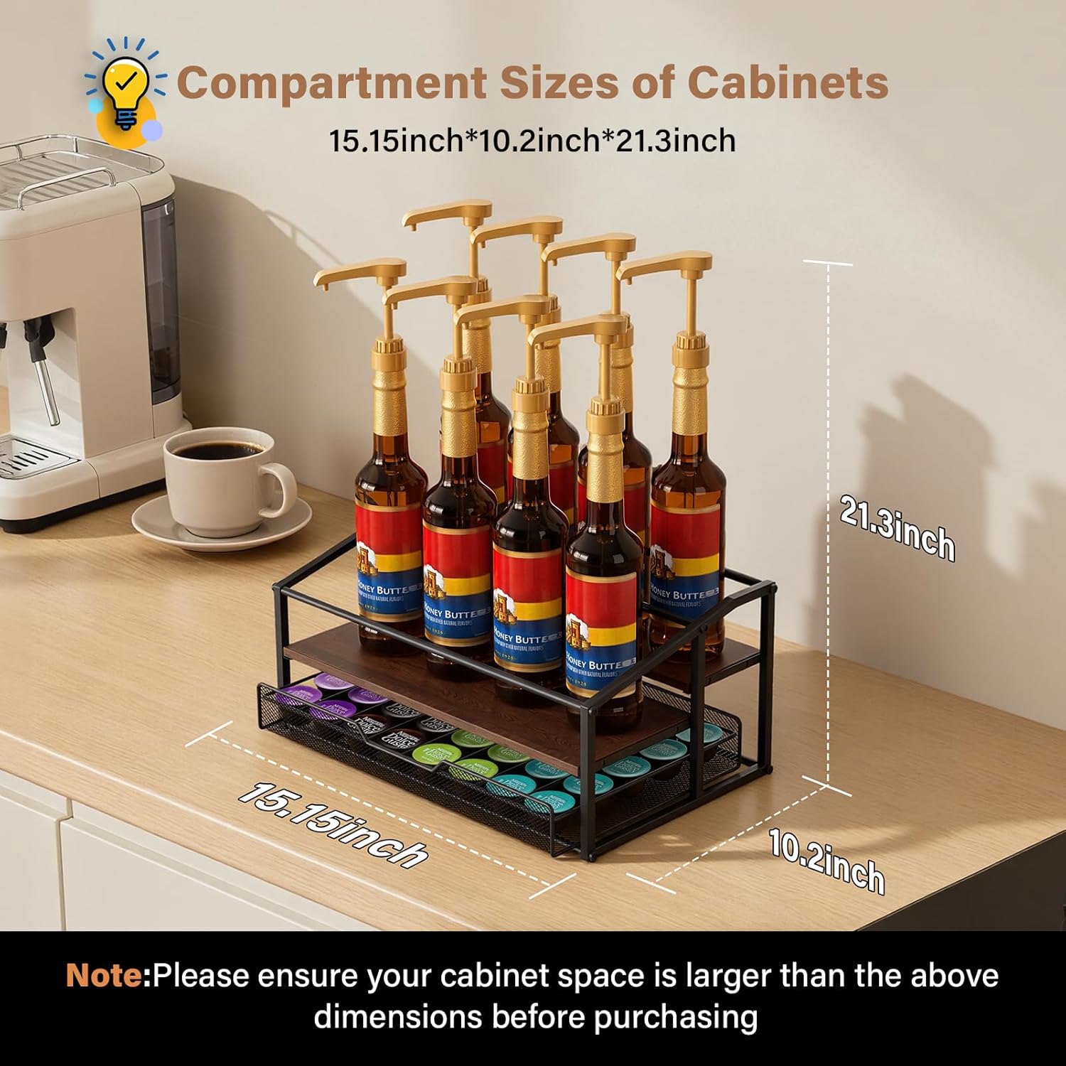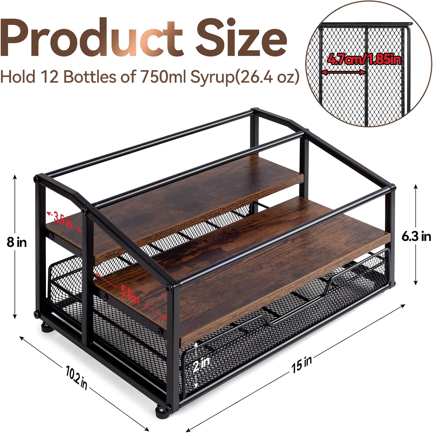- ·【Space Saving】💎- This coffee syrup rack measures 15.16" X 10.24" X 9.53" with drawer depths of 3.5’’ and 6’’. Suitable for desktop or countertop, it takes up little space and maximizes vertical space. This syrup holder for coffee bar features a stepped design that allows for neat placement and easy access to your favorite syrups, keeping your space neat and organized.