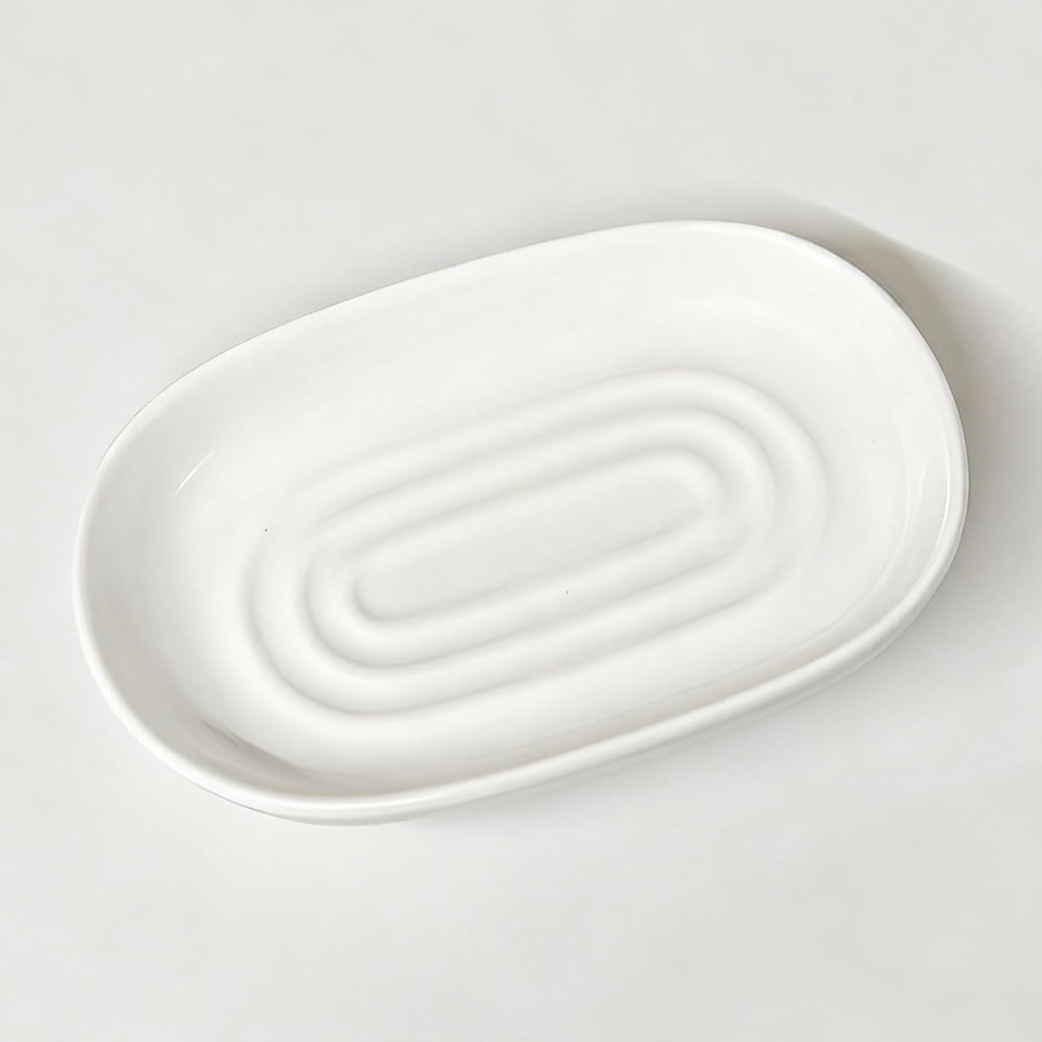 Ceramic Soap Dish, Marble Texture, Raised Ridge, Smooth Surface, Easy to Clean, Non-Slip Base, Fits Standard Bar Soap (White)