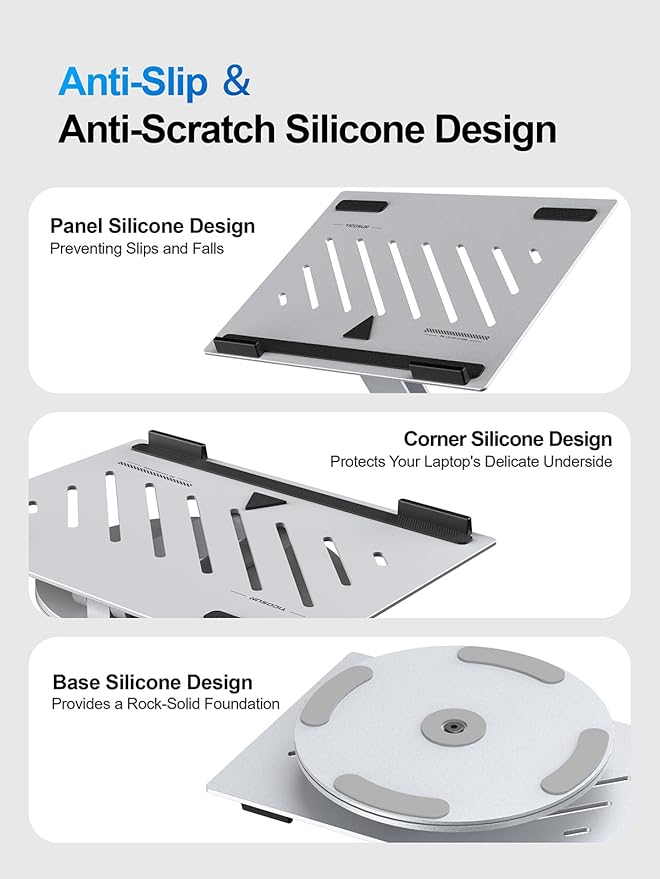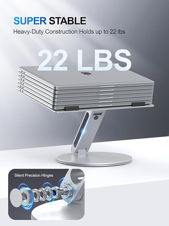 - Enhanced Stability, Protection & Silent Operation:Constructed from premium aluminum alloy, Computer holder for laptop ensures heavy duty stability with a large base to prevent wobbling or tipping. The silent precision hinges allow for noiseless repositioning, while non-slip silicone pads securely hold your notebook up to 22lbs, providing reliable scratch and slip resistance.
