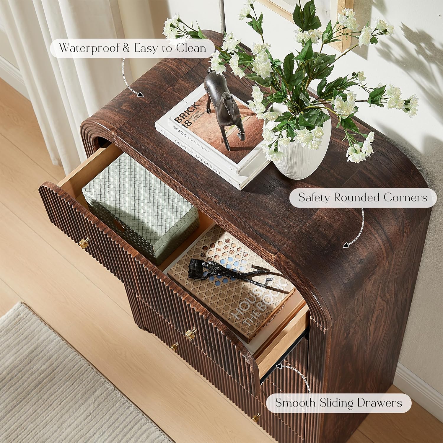 - Timeless Elegance Meets Modern Chic: This dresser featuring a smooth curved silhouette and vertical stripe grain in an wood finish. Luxury coated metal handles exude an elegant ambiance. Its versatile style effortlessly complements a wide range of bedroom décors, from Scandinavian to contemporary.