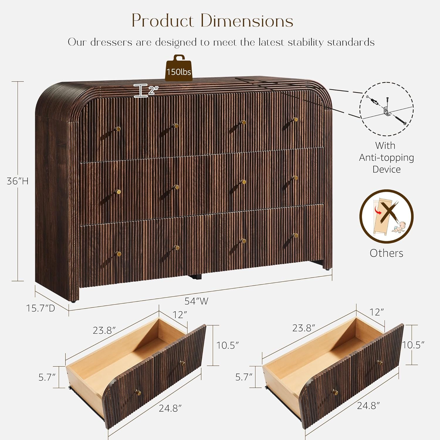 T4TREAM Fluted 6 Drawers Dresser for Bedroom, 54" Wide Modern Chest of Drawers with Thickened Curved Profile Design, Wood Dressers TV Stand for Bedroom, Living Room, Hallway, Dark Walnut