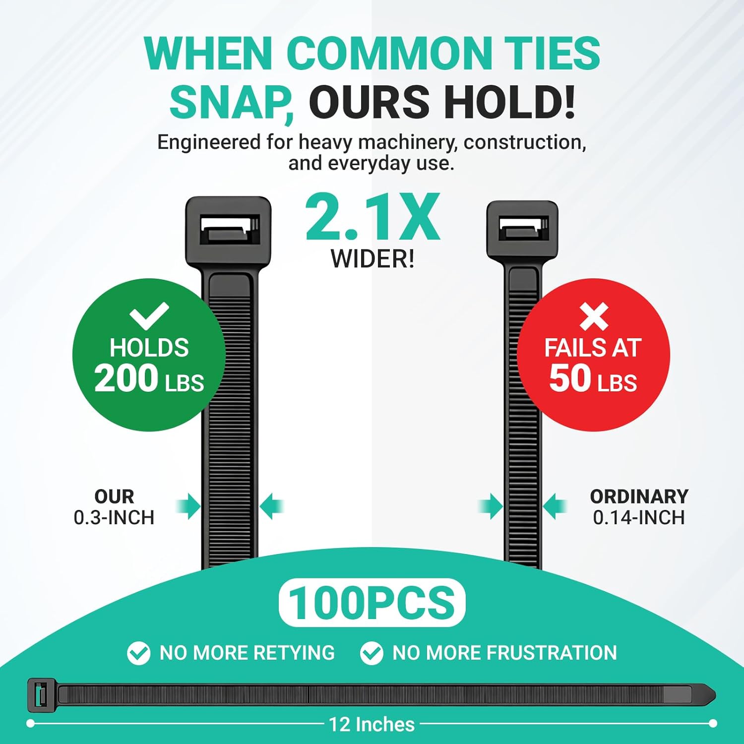 - OUTPERFORMS ORDINARY TIES: Ordinary ties fail at 50lbs, but this 100-piece pack handles construction, machinery, and daily tasks easily. 100% new materials make them odorless, fire-resistant, and anti-aging for long use.