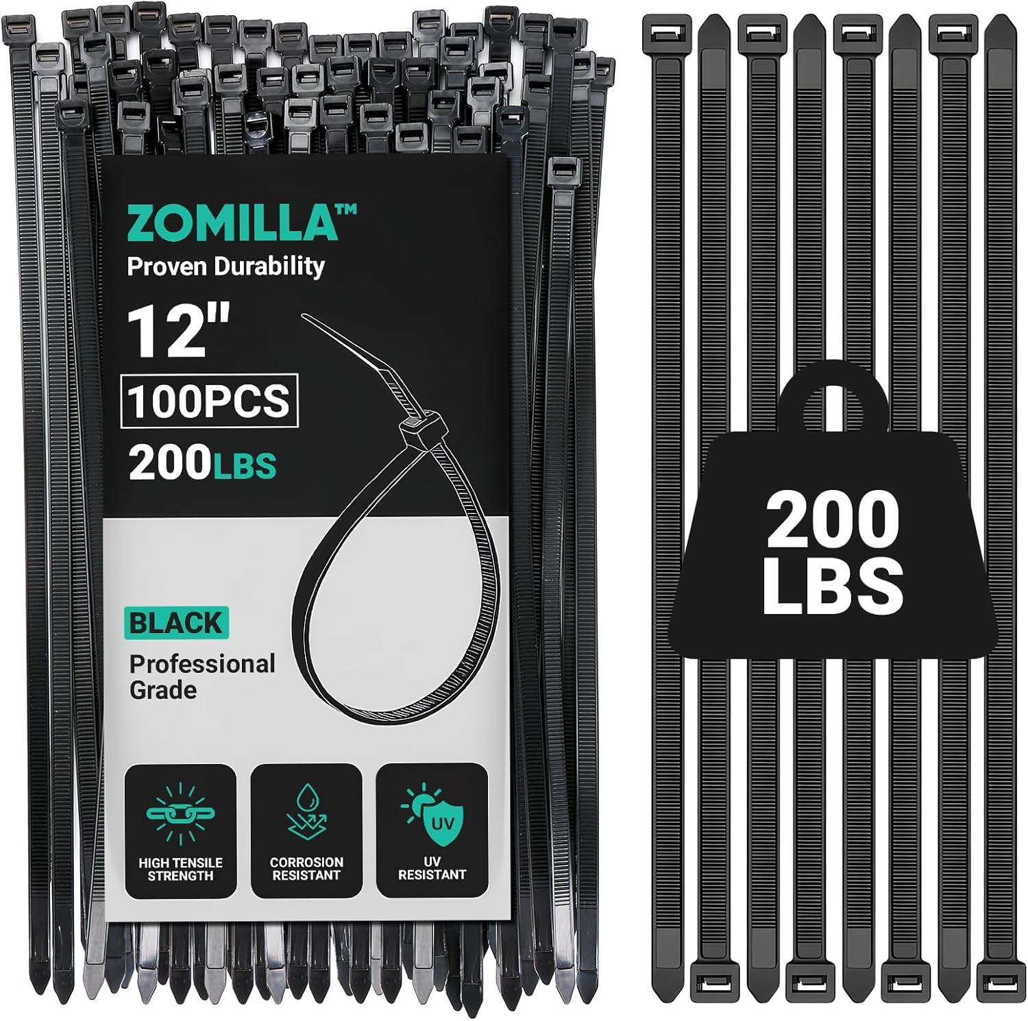 - 200LBS STRENGTH, 4X STRONGER: Zomilla’s 12-inch zip ties offer 200lbs tensile strength—4x that of ordinary ties. Rigorously tested for heavy use, they won’t snap or slip, no frustrating redoes, just reliable performance.