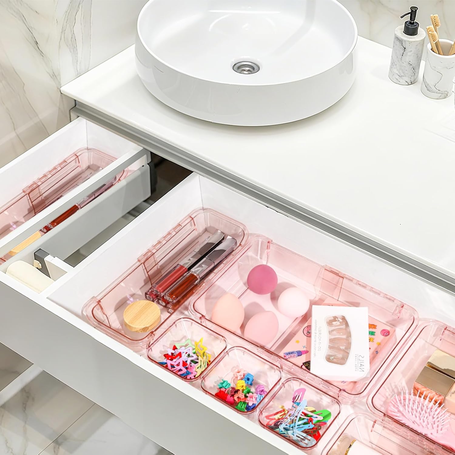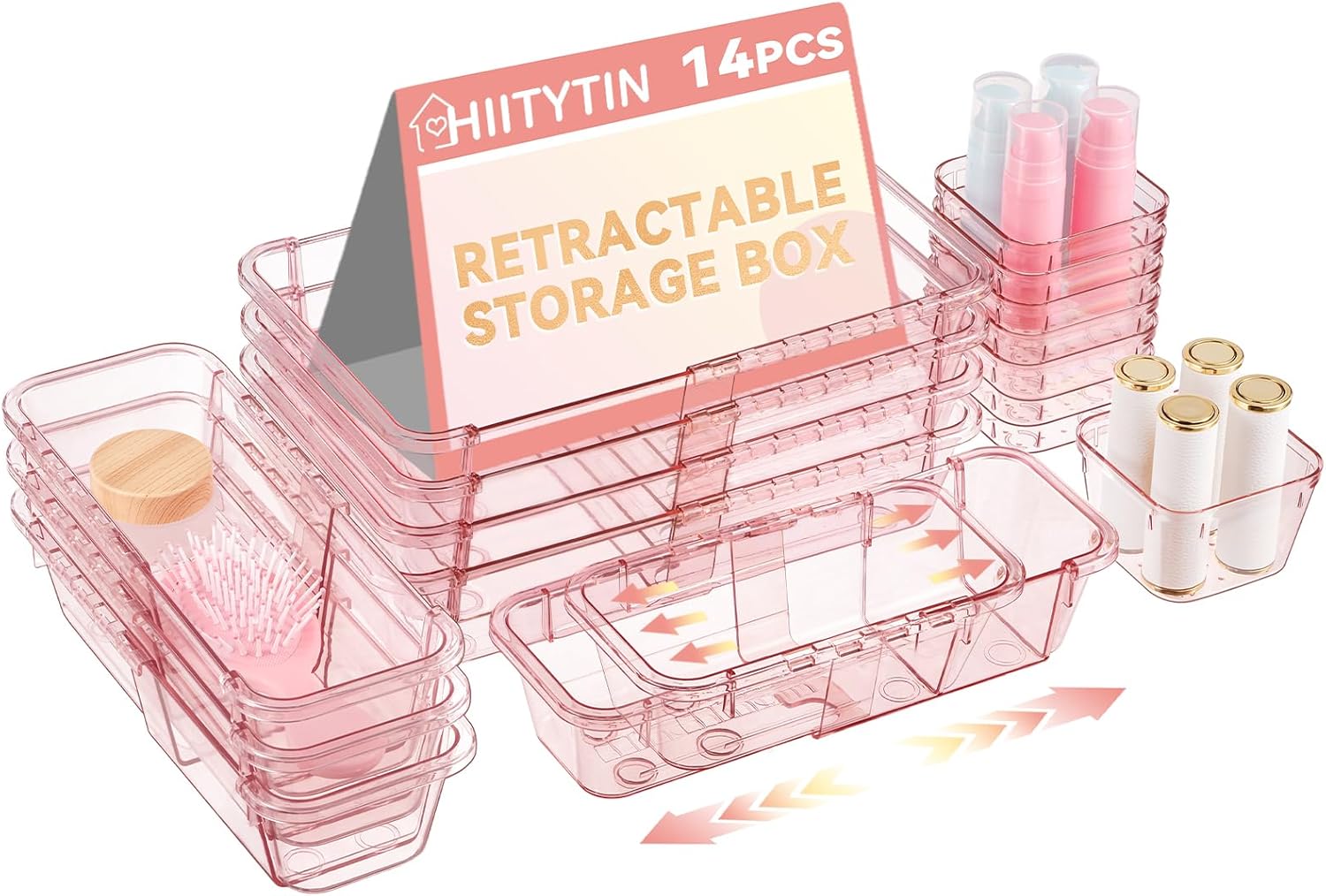 14 Pcs Adjustable Clear Drawer Organizer, Extendable Vanity Storage Bins, Desk Drawer Organizer Set for Makeup, Cosmetics, Bedroom, and Gadgets, Pink