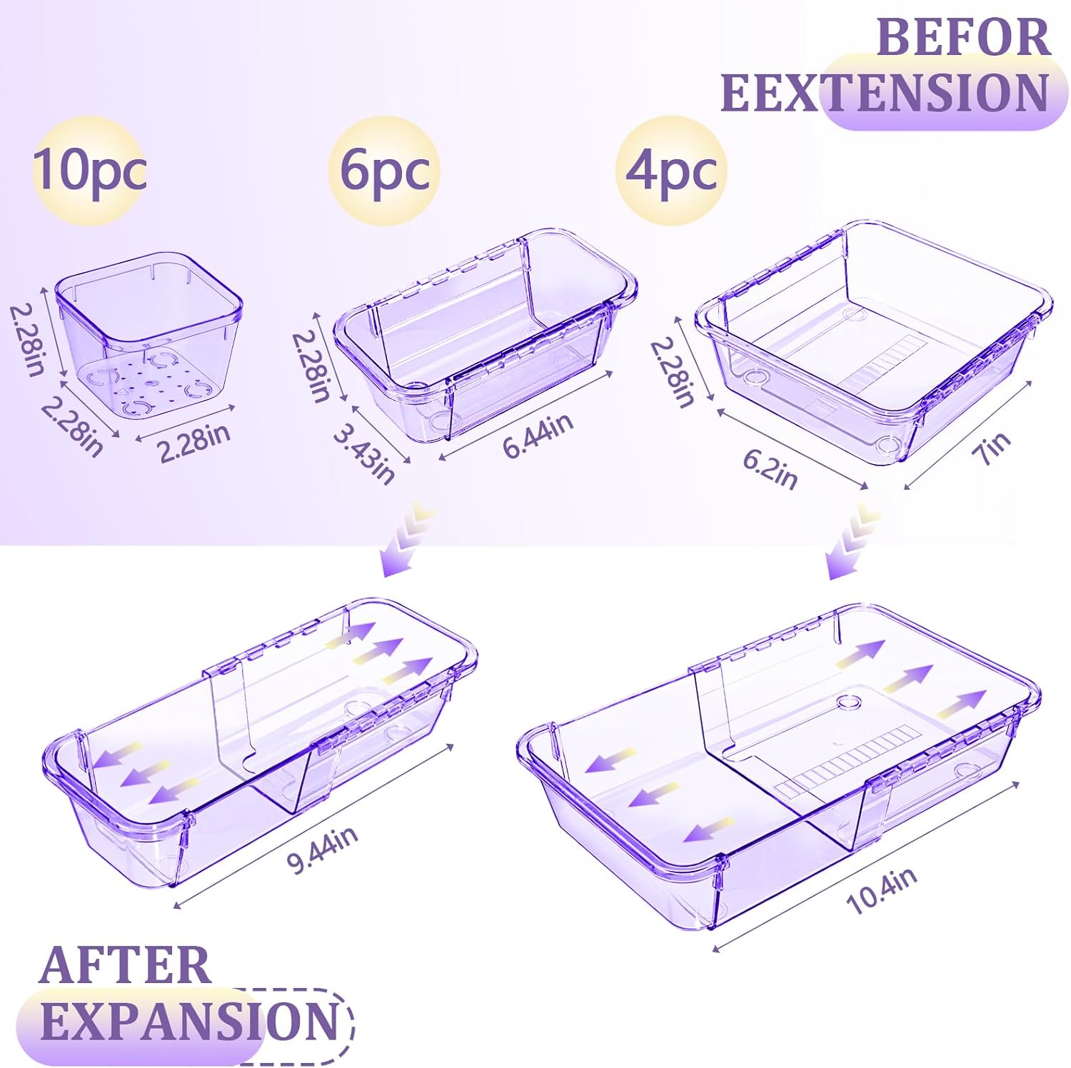 20 Pcs Adjustable Clear Drawer Organizer, Extendable Vanity Storage Bins, Desk Drawer Organizer Set for Makeup, Cosmetics, Bedroom, and Gadgets, Purple