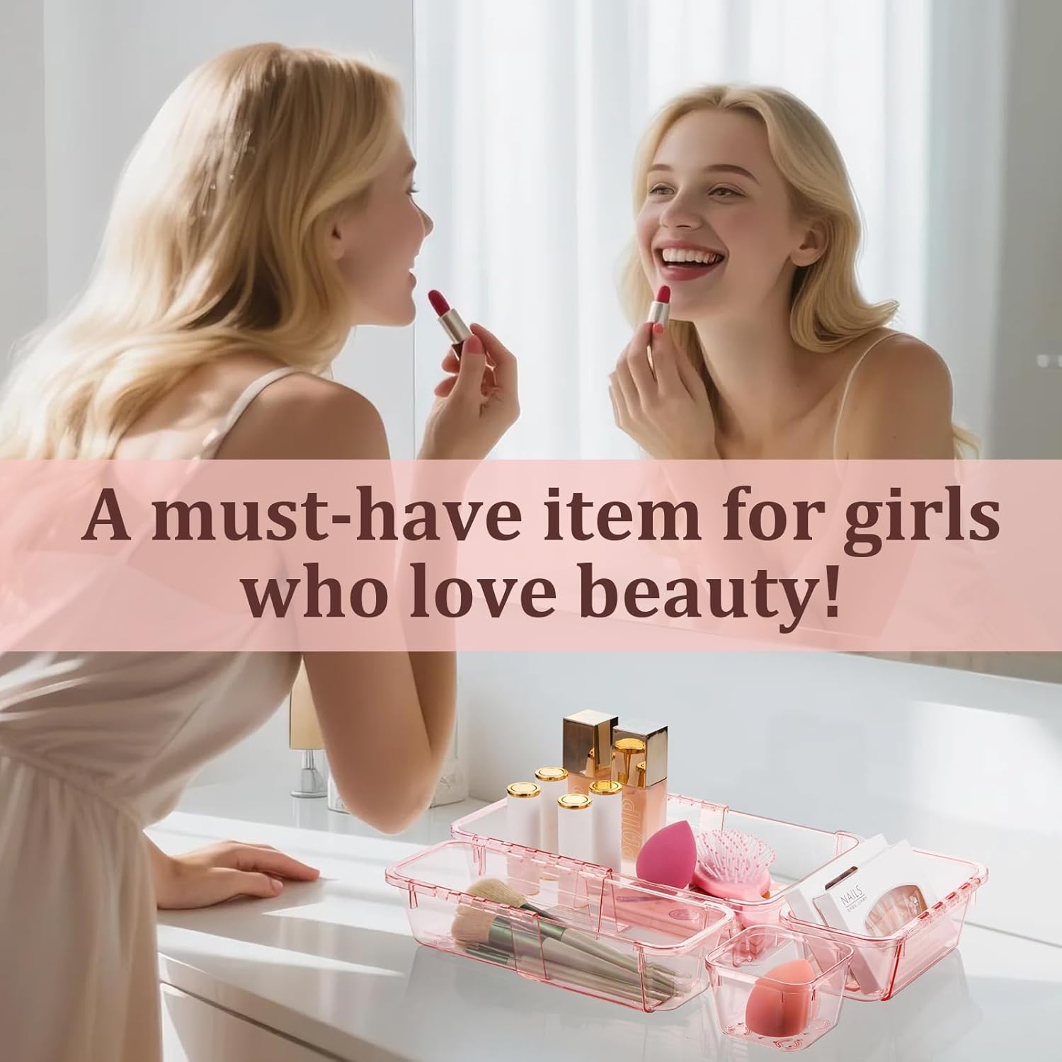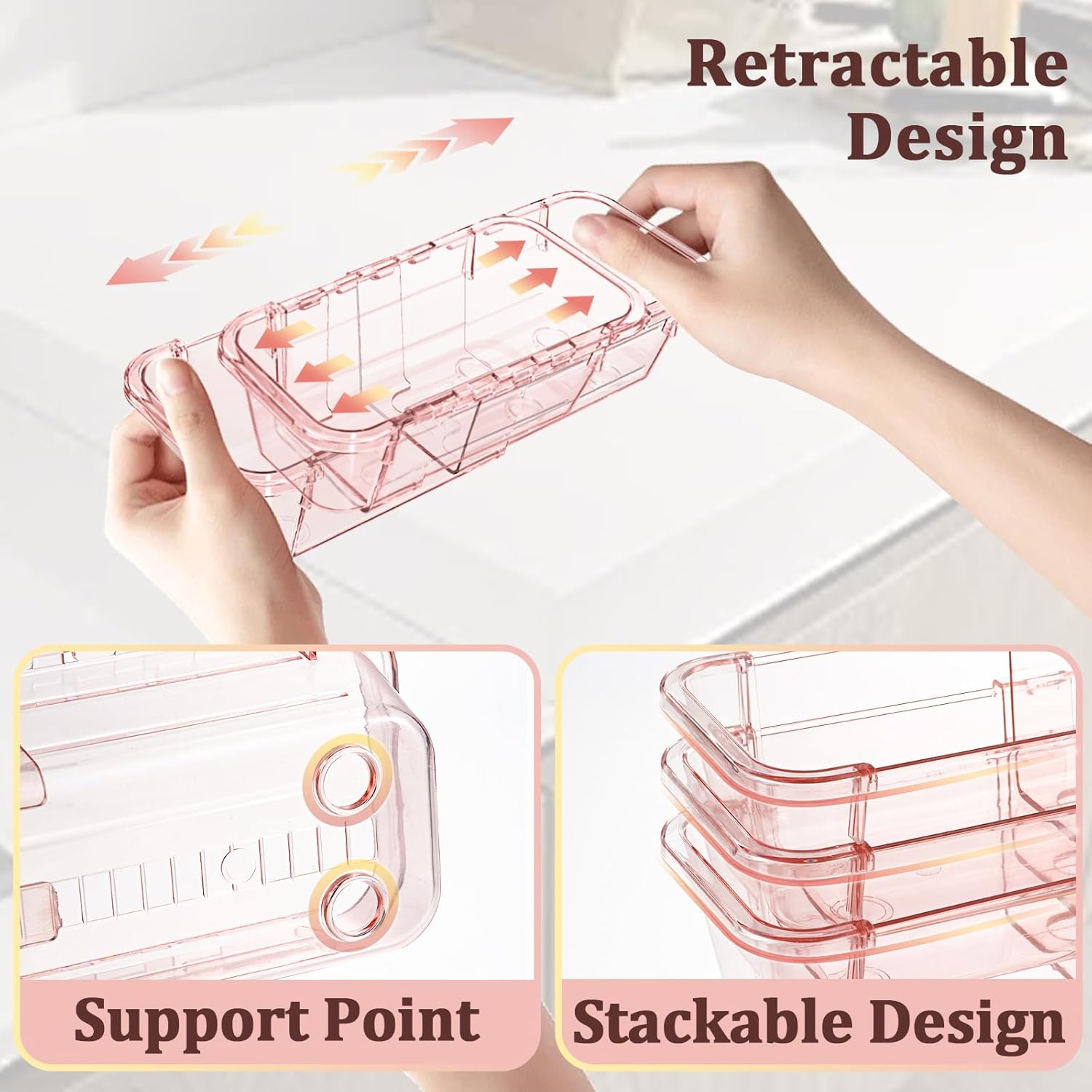 20 Pcs Adjustable Clear Drawer Organizer, Extendable Vanity Storage Bins, Desk Drawer Organizer Set for Makeup, Cosmetics, Bedroom, and Gadgets, Pink