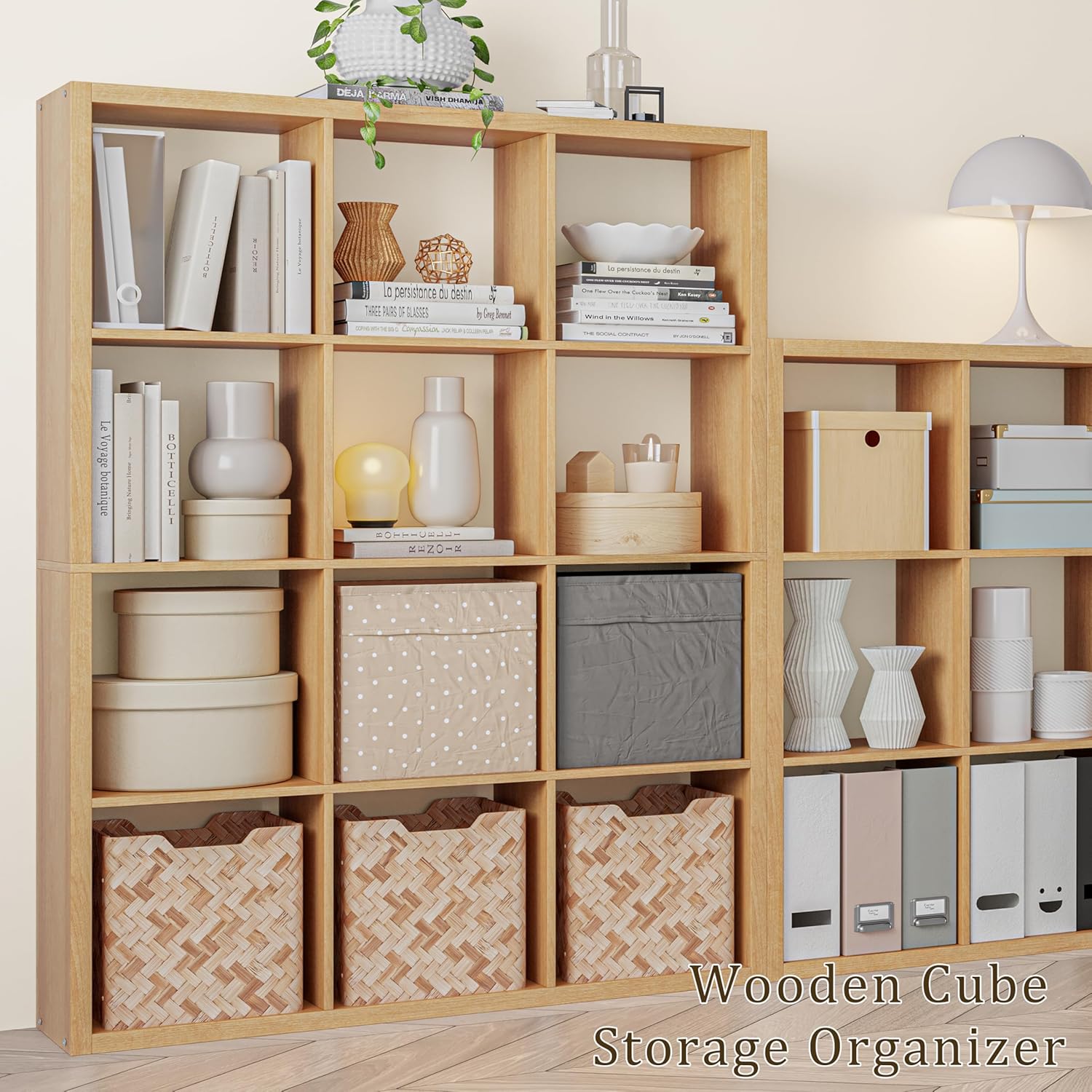 Cube Storage Organizer Bookcase, Decorative 11 inch Open Back Cubical Shelf with Thickened Border, Display Bookshelf for Living Room, Home Office, Sturdy Room (Natural Oak, 12 Cube)