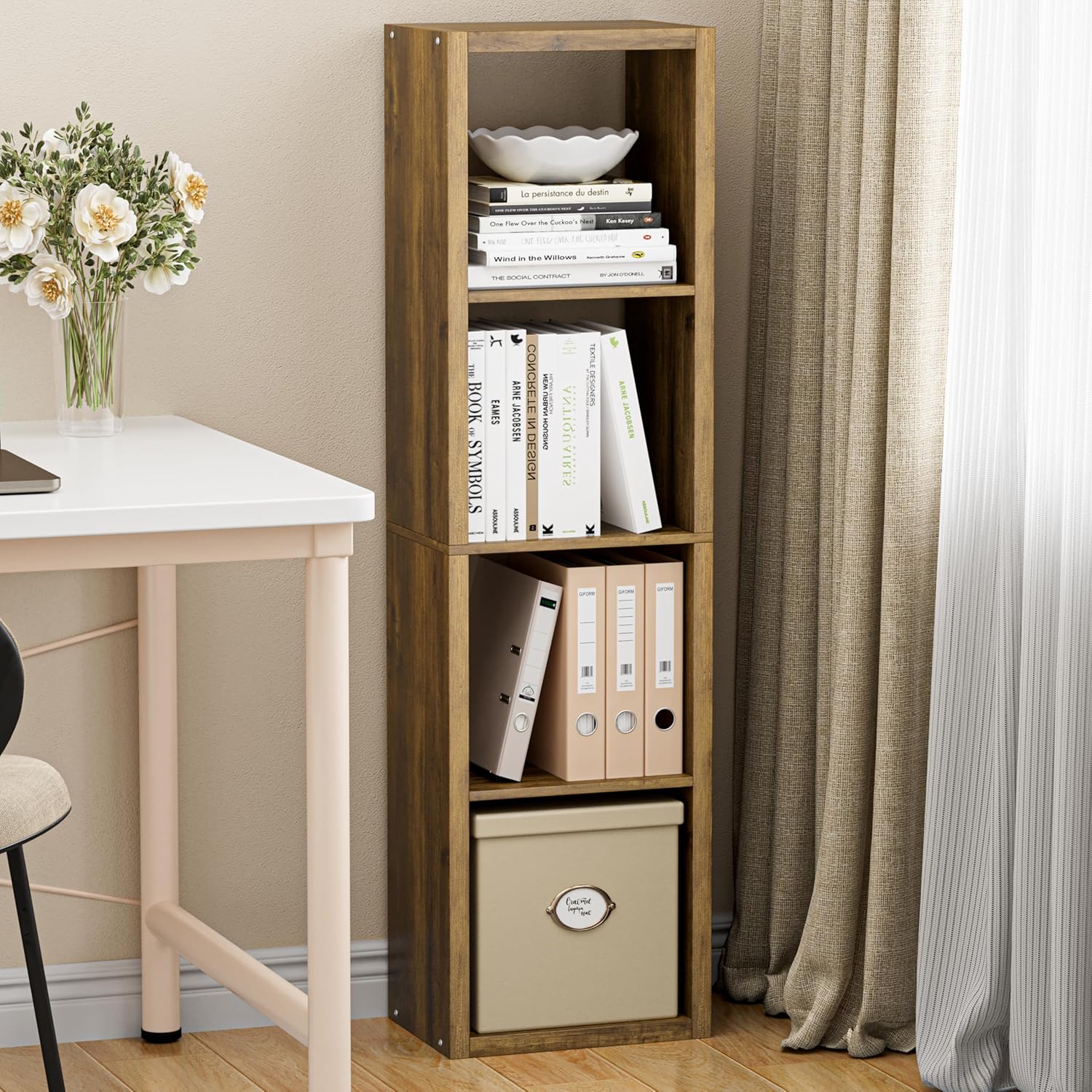 Cube Storage Organizer Bookcase, Small 4 Tier 11 inch Open Back Cubical Shelf with Thickened Border, Display Bookshelf for Living Room, Home Office, Sturdy Room (Brown, 4 Cube,Vertical)