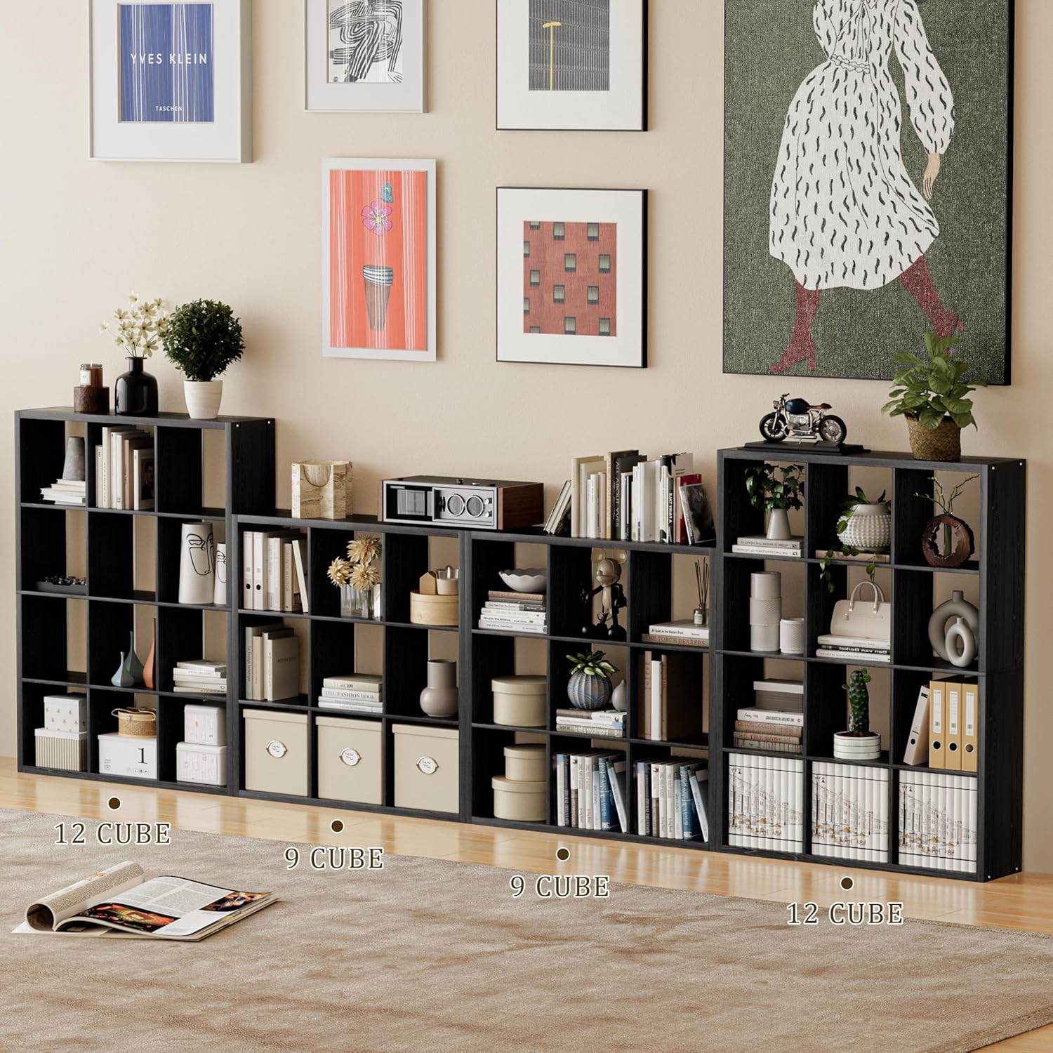 Cube Storage Organizer Bookcase, Decorative 11 inch Open Back Cubical Shelf with Thickened Border, Display Bookshelf for Living Room, Home Office, Sturdy Room (Black, 12 Cube)
