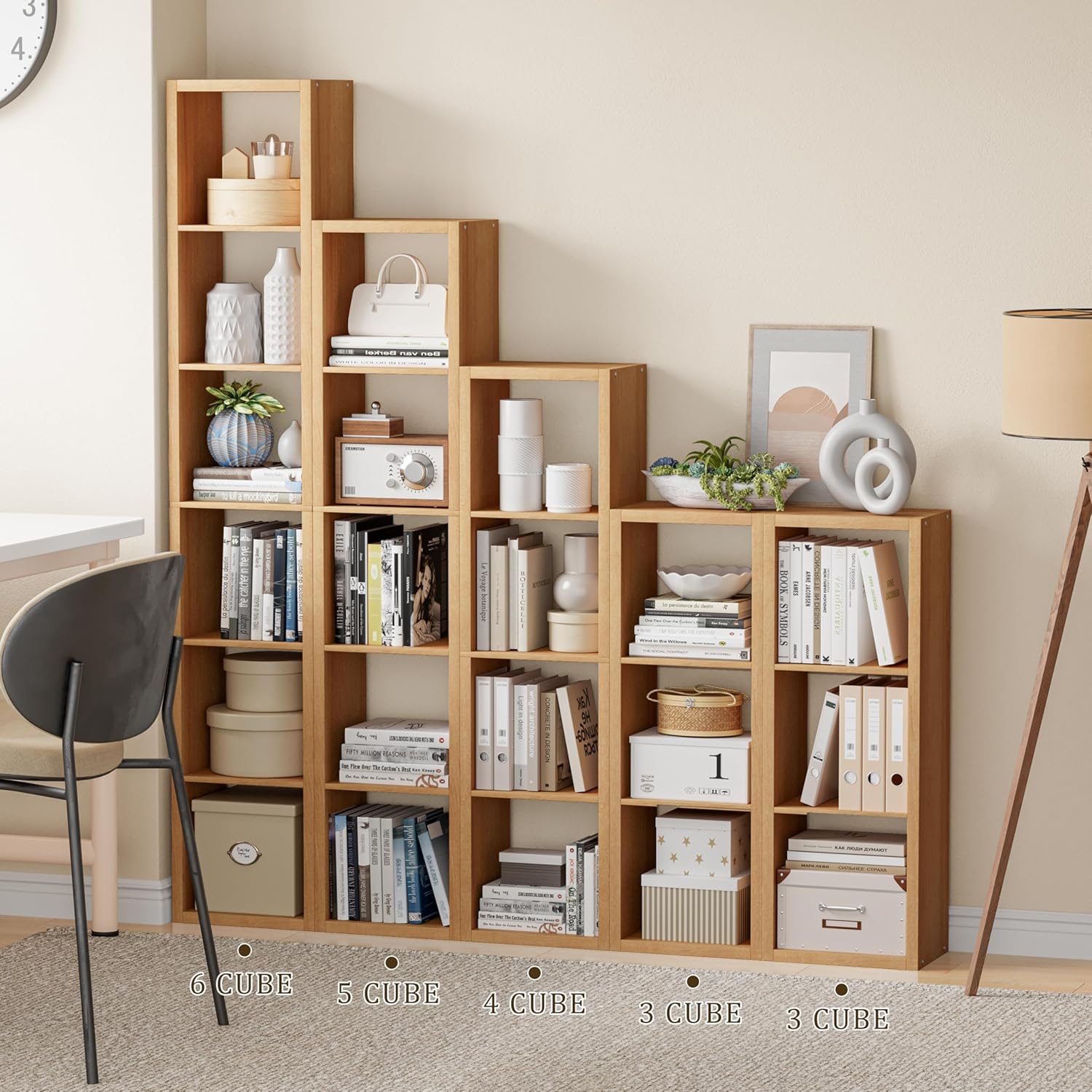 Tall Cube Storage Organizer Bookcase, 6 Tier 11 inch Open Back Cubical Shelf with Thickened Border, Display Bookshelf for Living Room, Home Office, Sturdy Room (Natural Oak, 6 Cube,Vertical)
