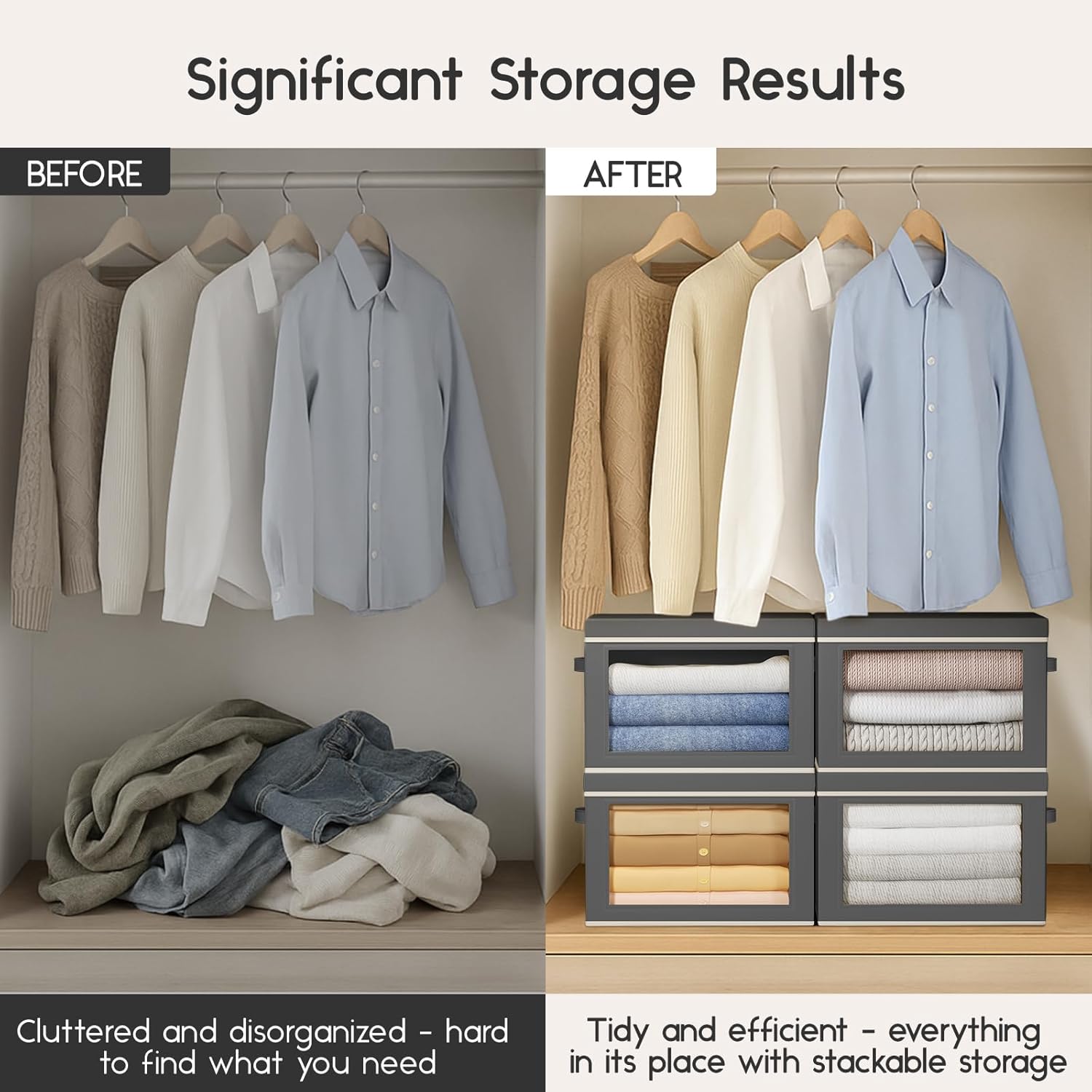 - [Stacking Storage Bins for Maximum Efficiency] Stackable design maximizes vertical space, perfect for organizing baseball caps, clothing, or other items. Keep your closet, living room, or office tidy and organized with these stacking storage bins.