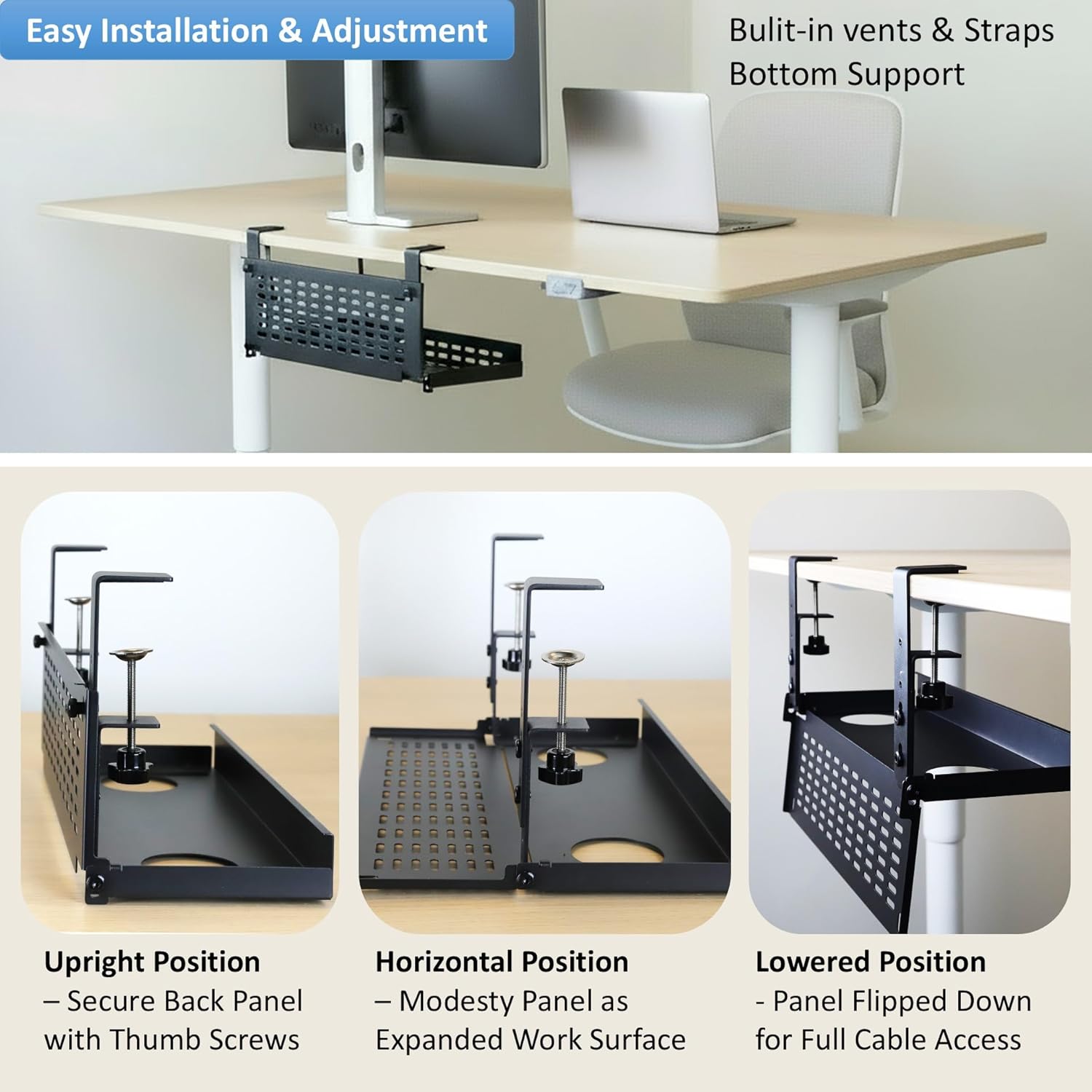 - Ergonomics Hinged Modesty Panel – Flips down or locks horizontally for easy access to power strips and cables during setup or maintenance.