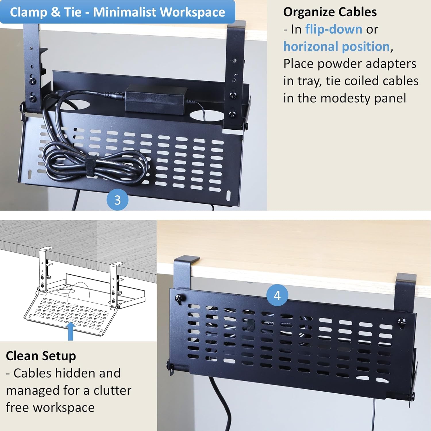 AEONS Universal Under Desk Cable Management Tray-Clamp Mount Hinged Swing Modesty Panel Organizer for Office Desks, Easy Access Flip-Down Position Power Strip Cord Storage No-Drill, 25 lb Capacity