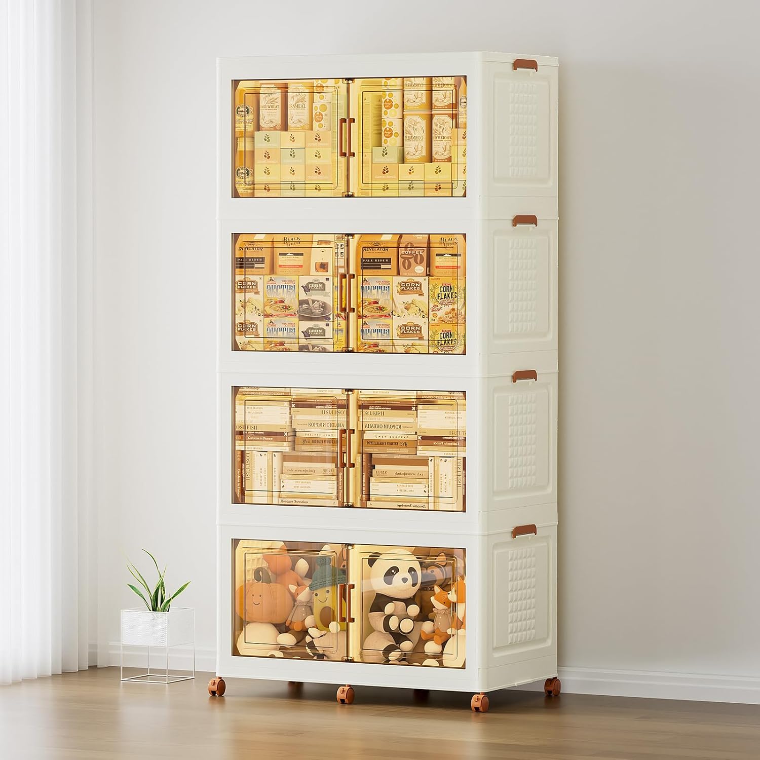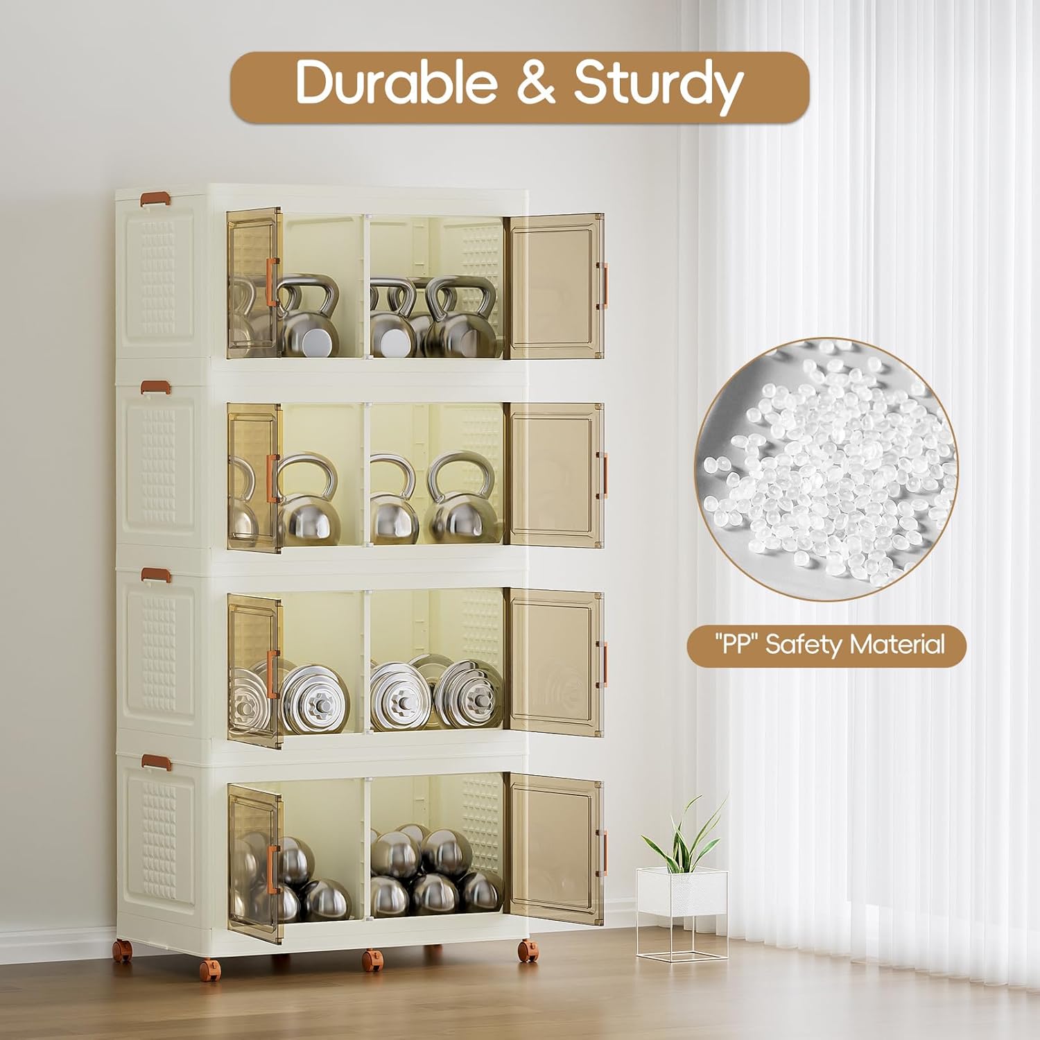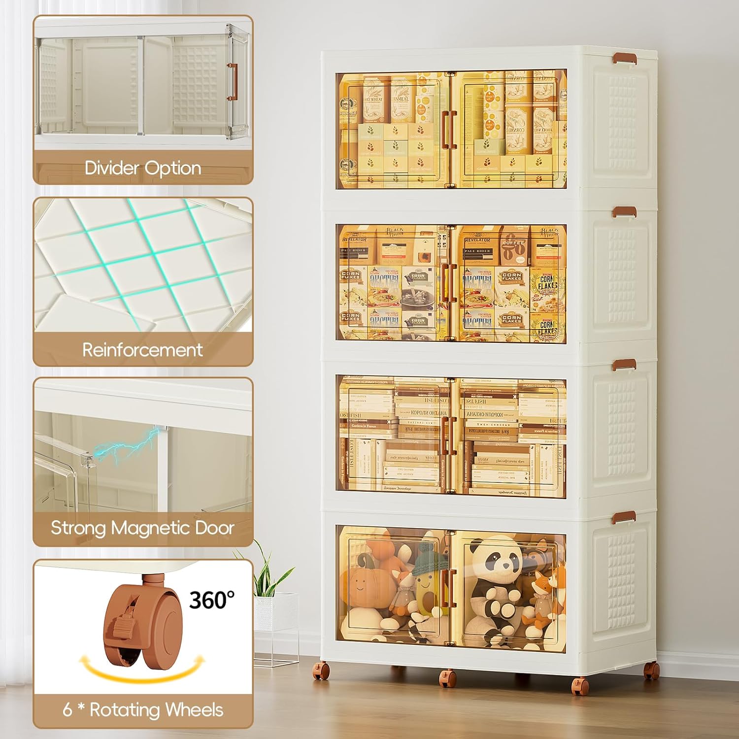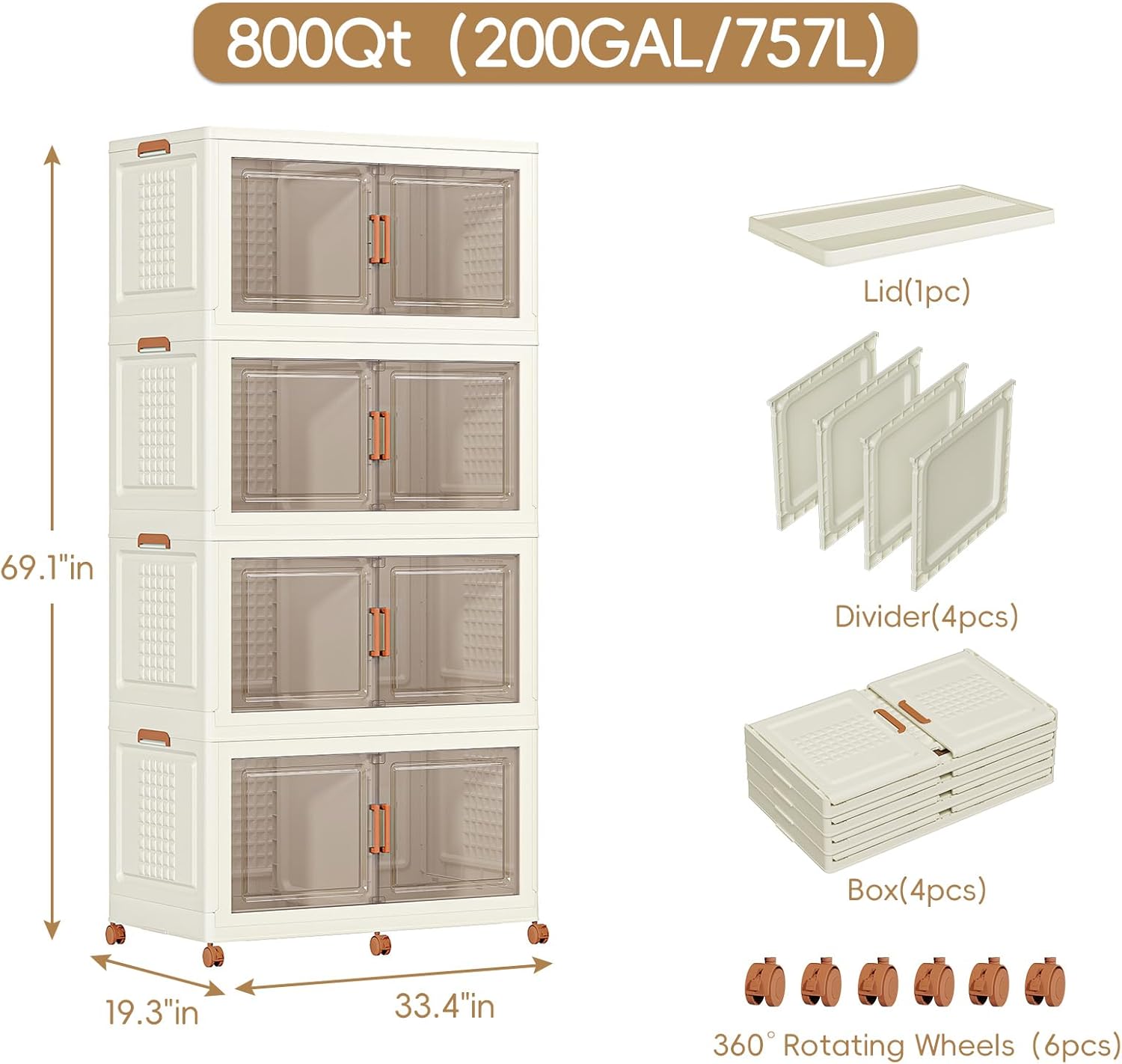 JEKO&JEKO 800Qt Foldable Storage Bins with Lids, Doors & Dividers, Stackable Plastic Drawers with Wheels for Home, Closet & Garage Organizer, 4 Pack, Cream
