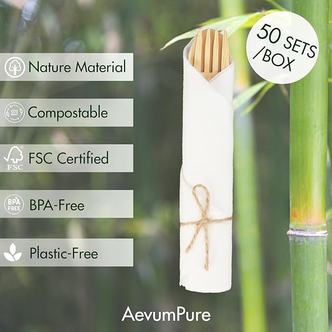 - >PROTEXT YOUR SAFETY:Disposable bamboo silverware was made by FSC-certified natural bamboo,the napkins made by 100% FSC-certified birch wood pulp, All is compostable material,it's BPA-FREE and Plastic-Free for product and packaging.