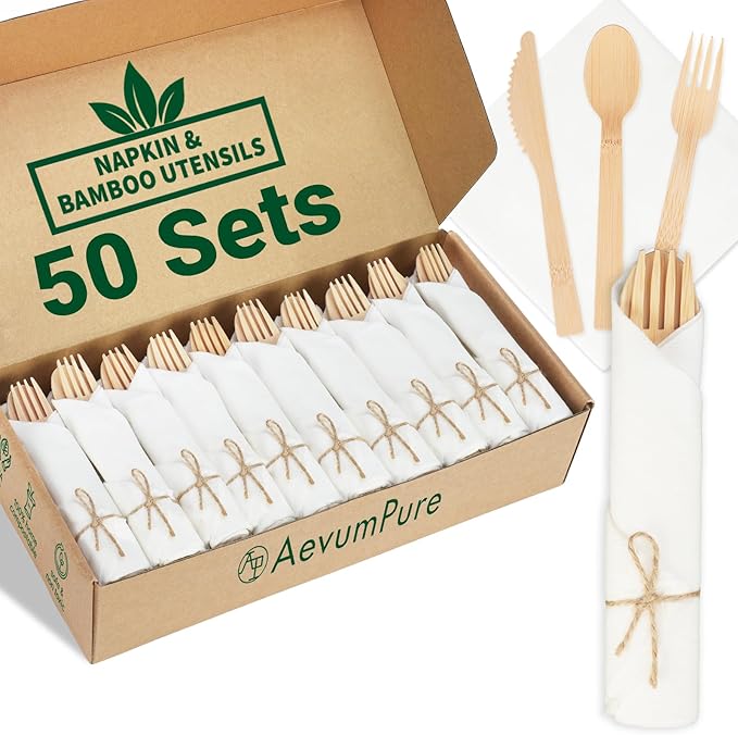 - >PRACTICALITY:The bamboo cutlery is thickened、 smooth、 splinter-free and odorless. disposable forks and spoon is splinter-free,knife is sharp-sturdy.It's more strong than plastic disposable cutlery.The Napkin is thick tissue and twill fabric,so three times more absorbent than regular paper towels, and does not decompose or paper scraps when wet.