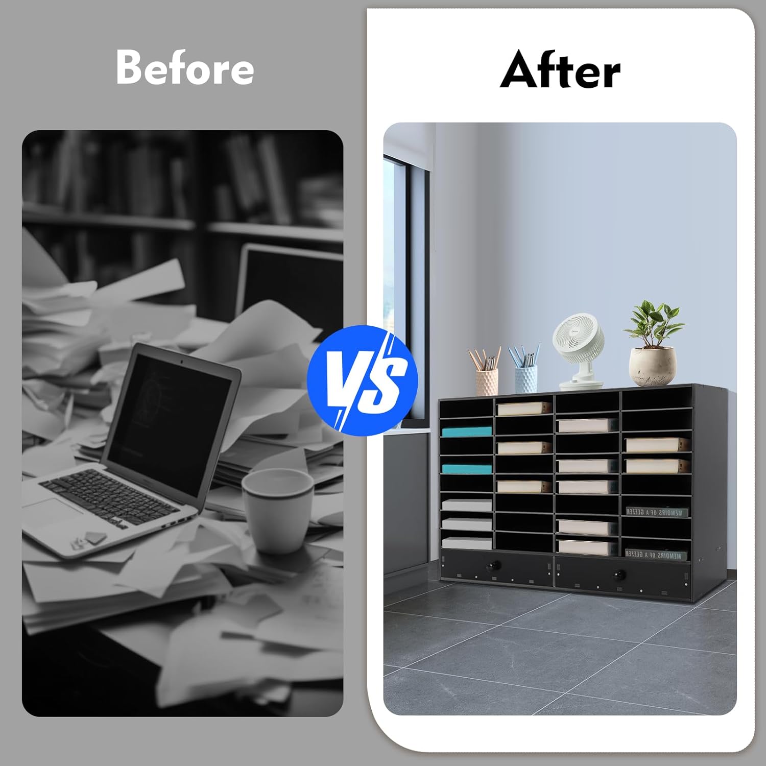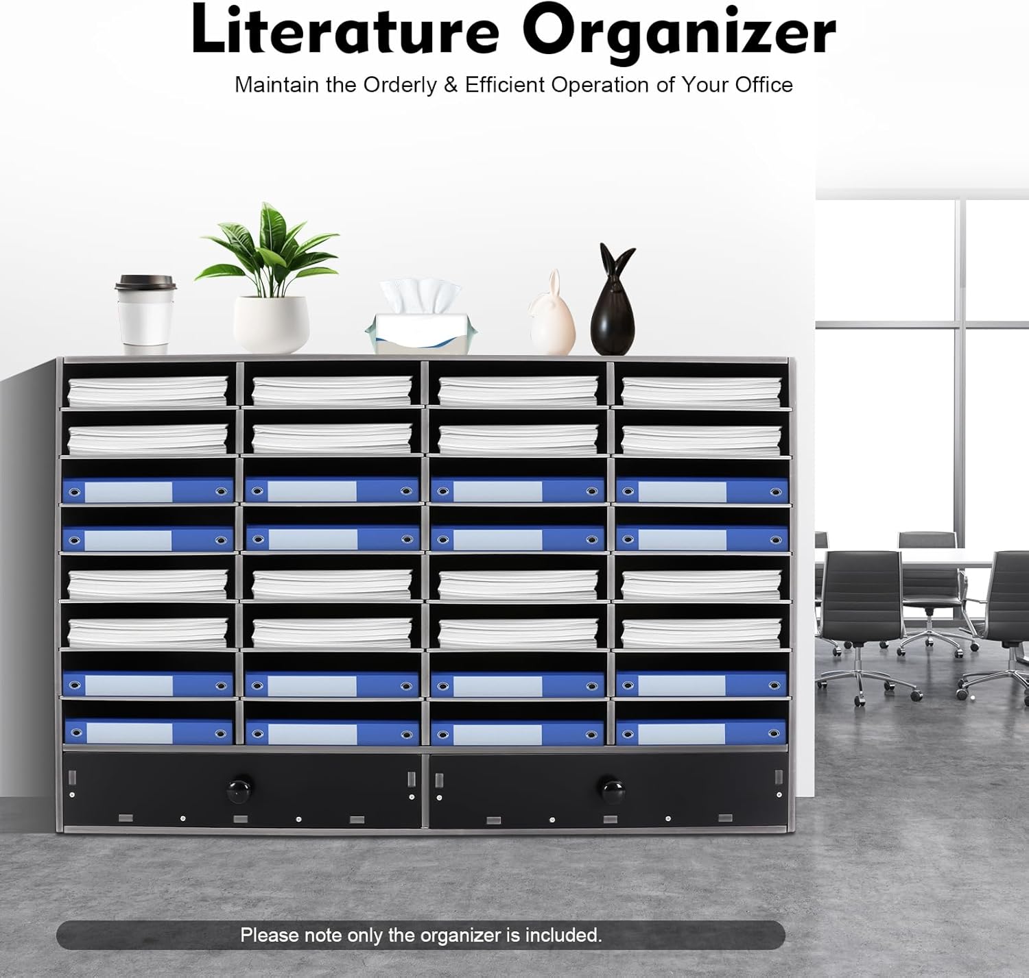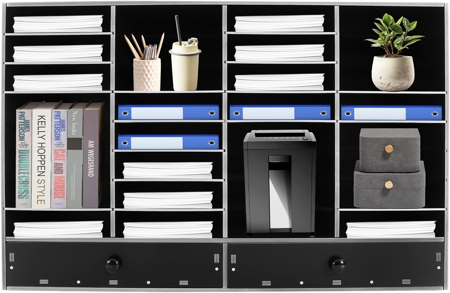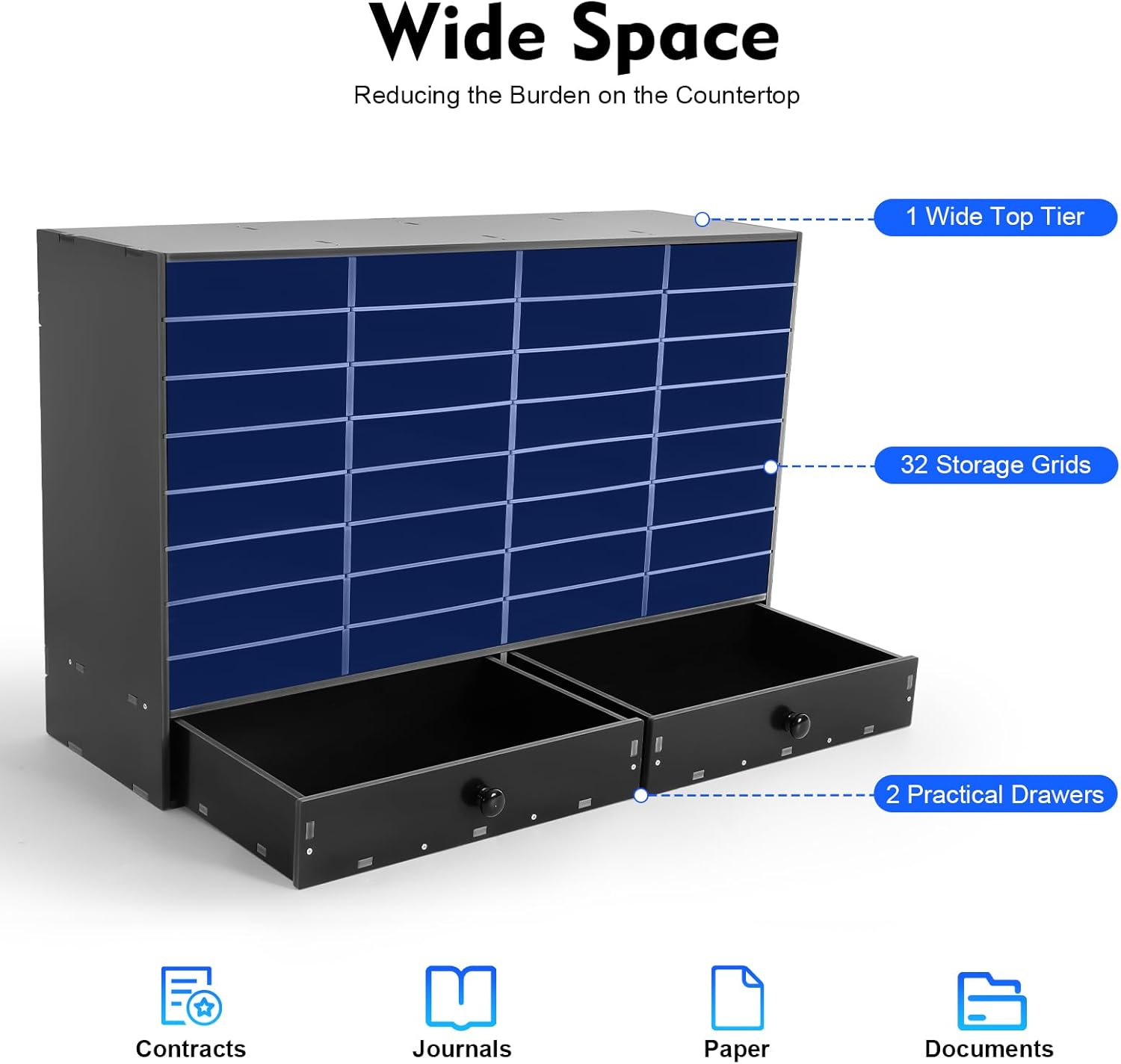Literature Organizers, Mail Sorter Organizer Adjustable Shelves and 2 Drawers Desktop File Sorter Paper Organizer for Home School Office (Black, 32 Slots with 2 Drawers)