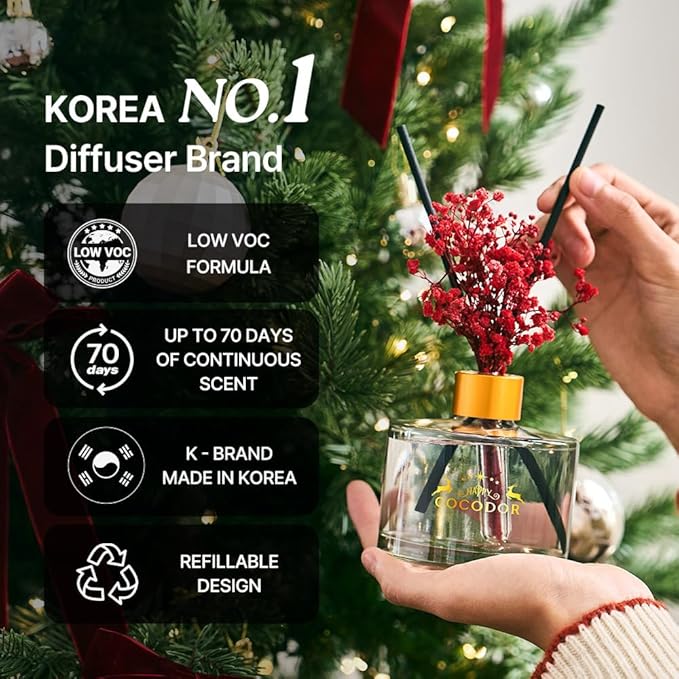 - Reed Diffuser Set – Includes 6.7oz of essential oil in an elegant package featuring a festive Christmas tree illustration, red Baby’s Breath Flower and a gold-foil Rudolph label. This diffuser creates a cozy Christmas atmosphere, filling your space with joy and holiday spirit for a prolonged fragrance experience.