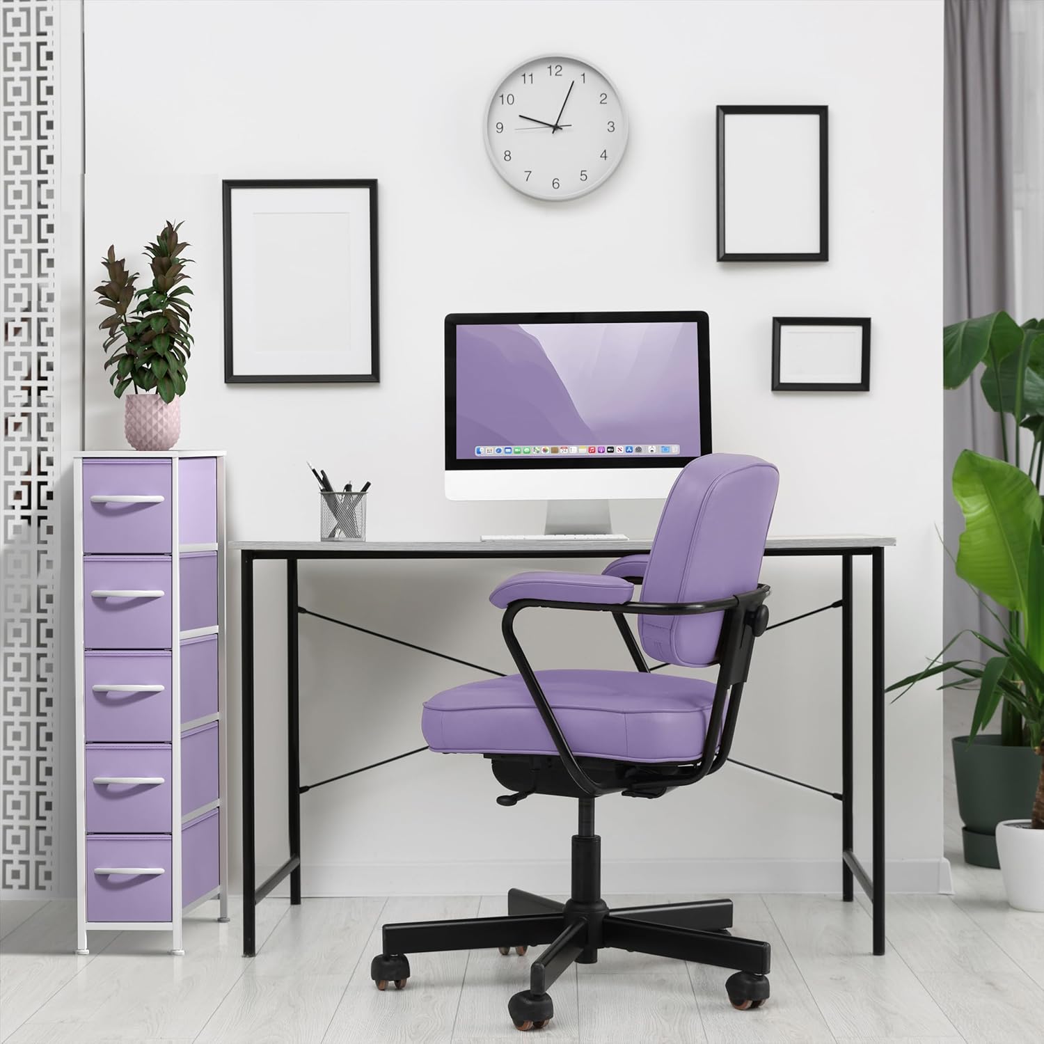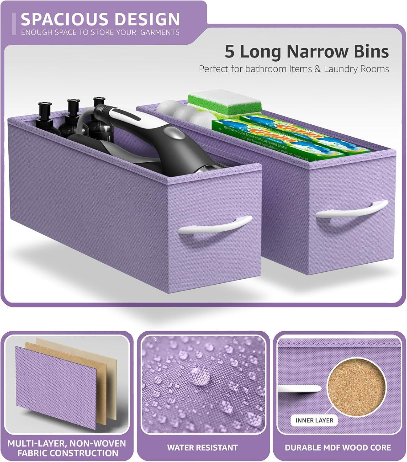 - Narrow 5 Drawer Dresser: This multipurpose bedroom dresser can be used as an end table, side table, or bedside table to store clothes, blankets, linens, lingerie, purses, scarves, socks, accessories, toiletries, makeup, cosmetics, office supplies, games, books, and more