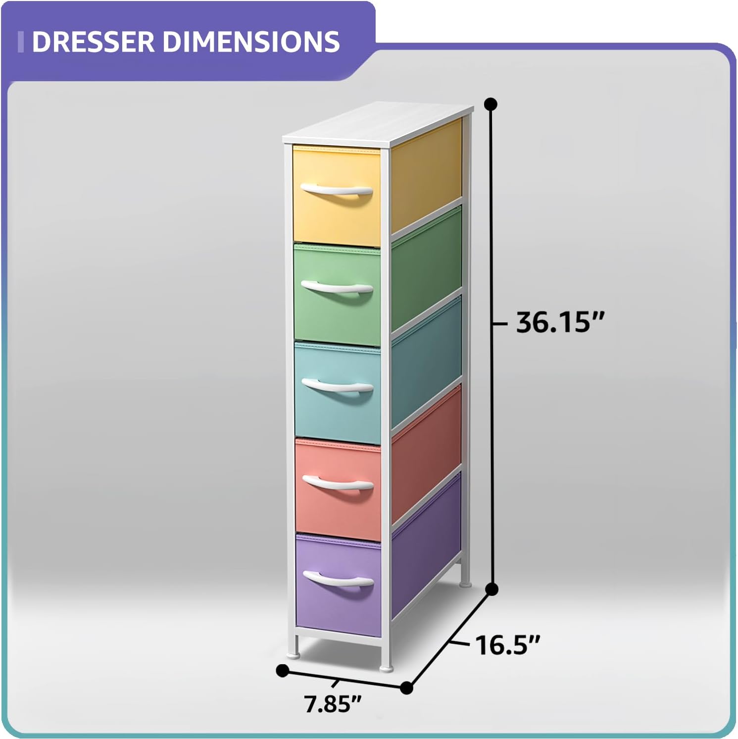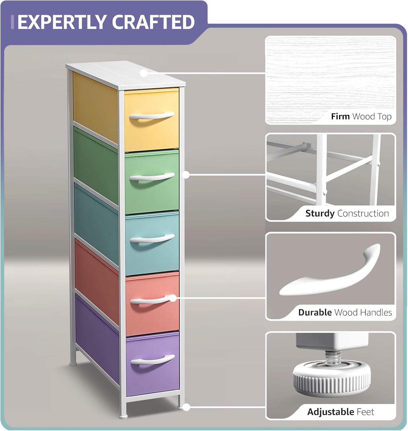 - Narrow 5 Drawer Dresser: This multipurpose bedroom dresser can be used as an end table, side table, or bedside table to store clothes, blankets, linens, lingerie, purses, scarves, socks, accessories, toiletries, makeup, cosmetics, office supplies, games, books, and more