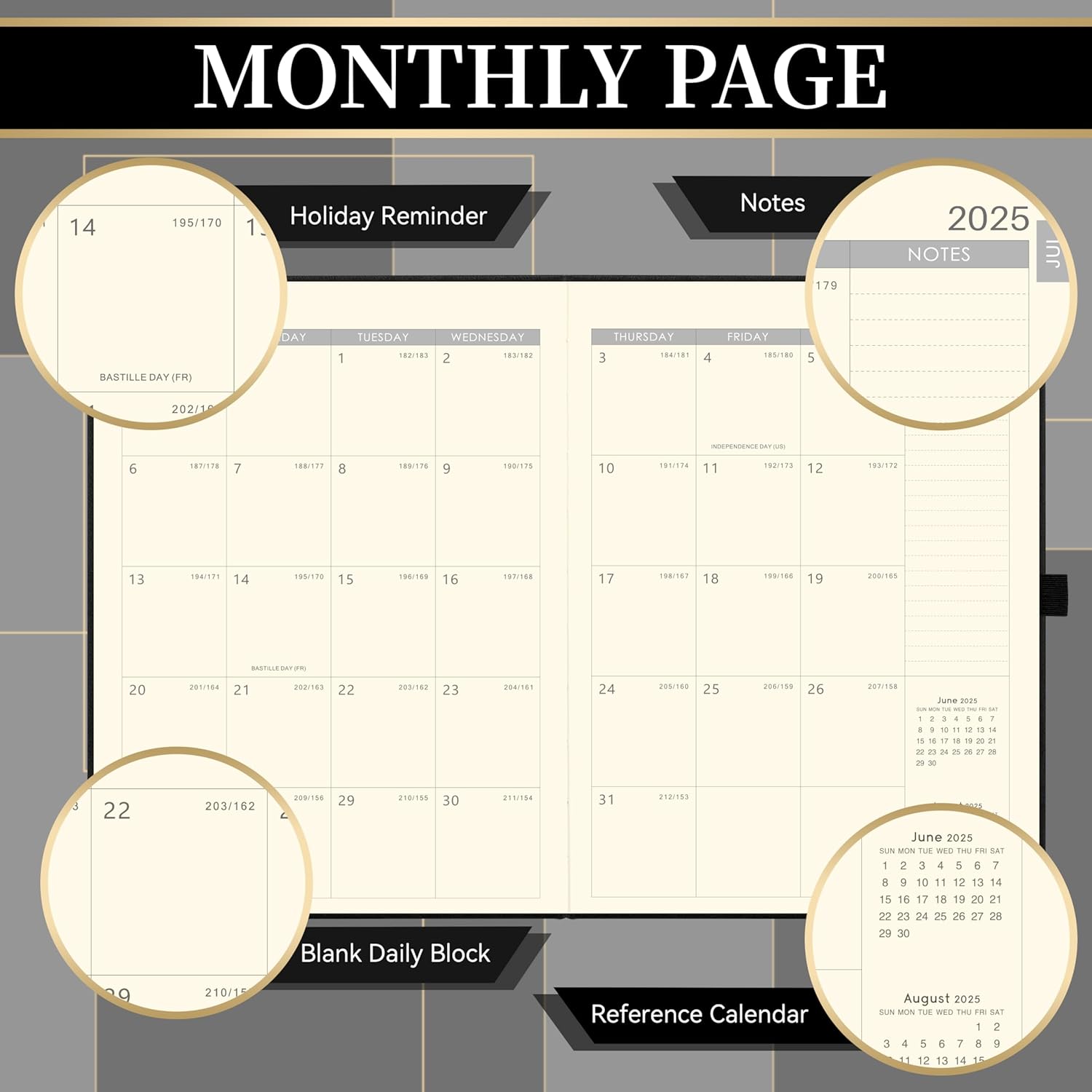 - Functional Designs - Hard Cover | Pen Loop | Elastic Closure Band | 12 Monthly Tabs | 2025-2026 Yearly Overview | 2 Contacts Pages | Quick Reference Information | 2025-2027 Holidays | Julian Dates | Notes Section.