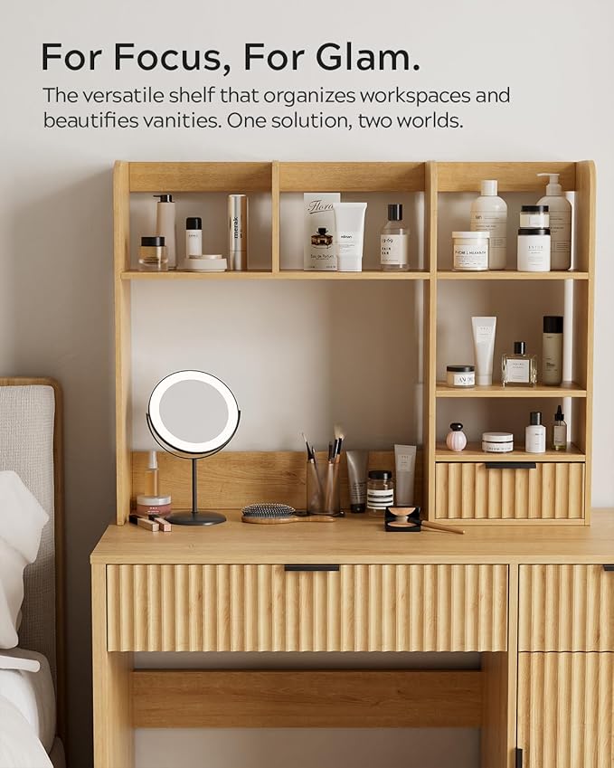 Desktop Bookshelf, Wood Desk Shelf with Fluted Drawer and 5 Shelves, Countertop Desk Hutch for Computer Desk, 3-Tier Display Rack Desk Shelf Storage Organizer for Dorm, Office, Natural Oak