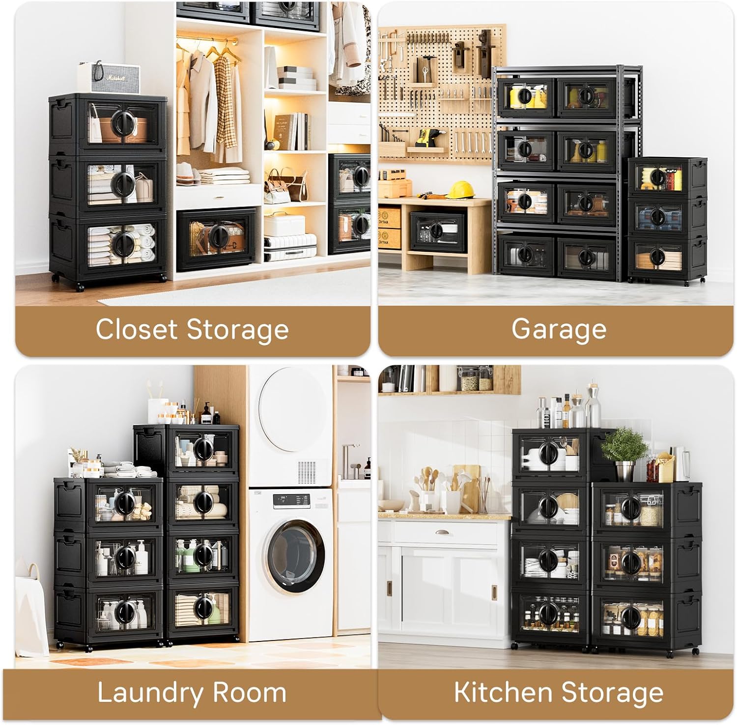 JEKO&JEKO 498Qt Lockable Stackable Storage Bins with Lids, Collapsible Closet Organizer with Wheels, Plastic Cabinet Drawer for Clothes, Dorm Room 6 Pack (Black)