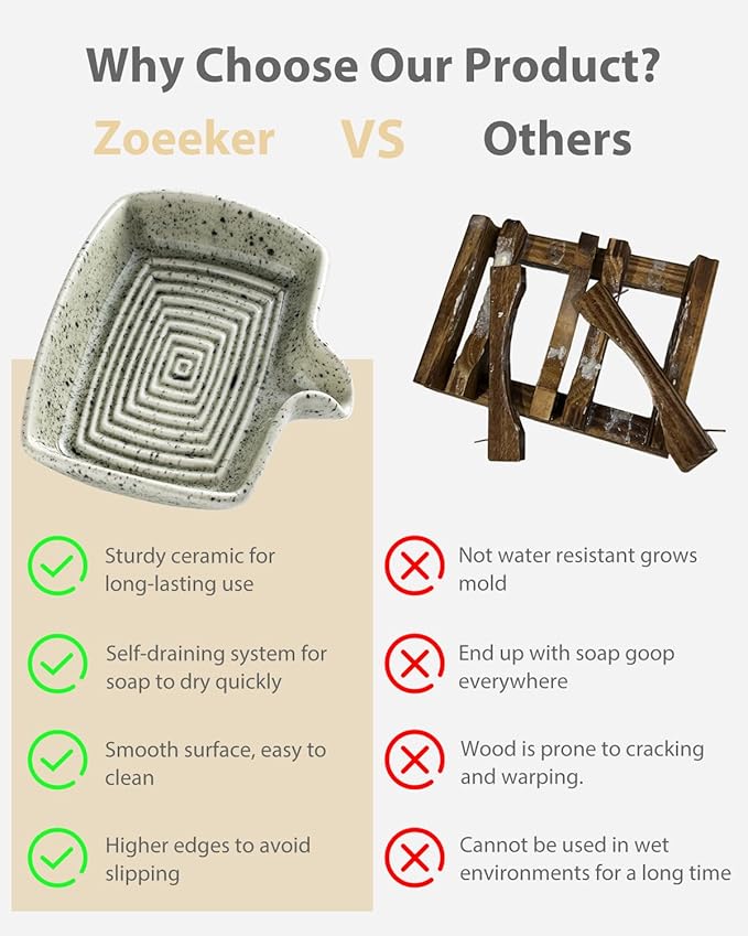 - Space-Saving: This ceramic soap dish features a compact, rectangular design that will save space efficient, ideal for maximizing limited counter space in bathrooms and kitchens