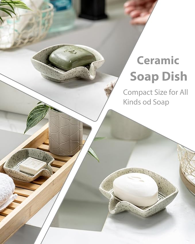 Self Draining Soap Dish, Ceramic Drain Soap Holder Waterfall Design Soap Saver for Shower, Bathroom, Sink, Kitchen and Countertop, Keeps Dry, Speckled Glaze