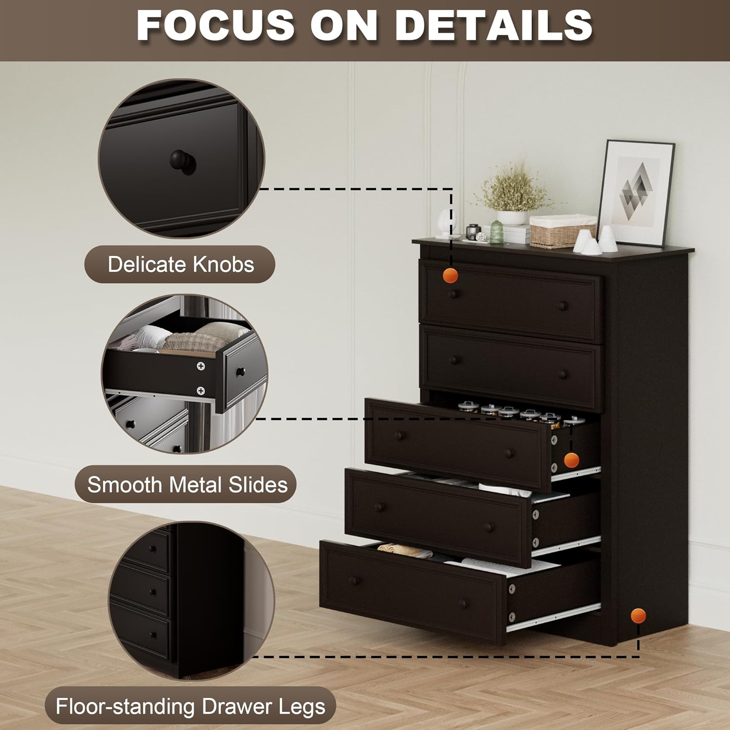 - 【Spacious 5 Drawer Design】This tall 5 drawer dresser offers generous storage with ample height and depth, perfect for organizing clothes, toys, books, and more. The spacious top (15.7" x 31.5") can hold decor, a small TV, or daily essentials.