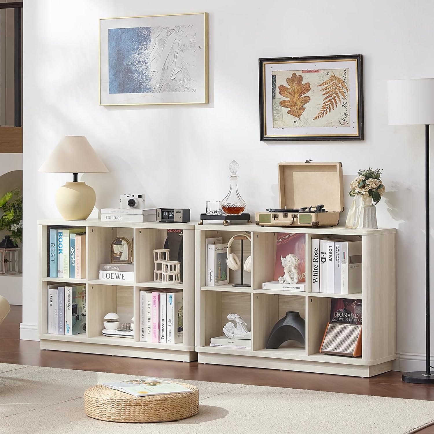6 Cube Bookcase, 40" Wide Low Horizontal Book Shelf w/Curved Edge, Wood Floor Standing 2-Tier Bookshelf with Base, Modern Short Storage Cabinet Book Case for Bedroom, Office, White Cream Oak