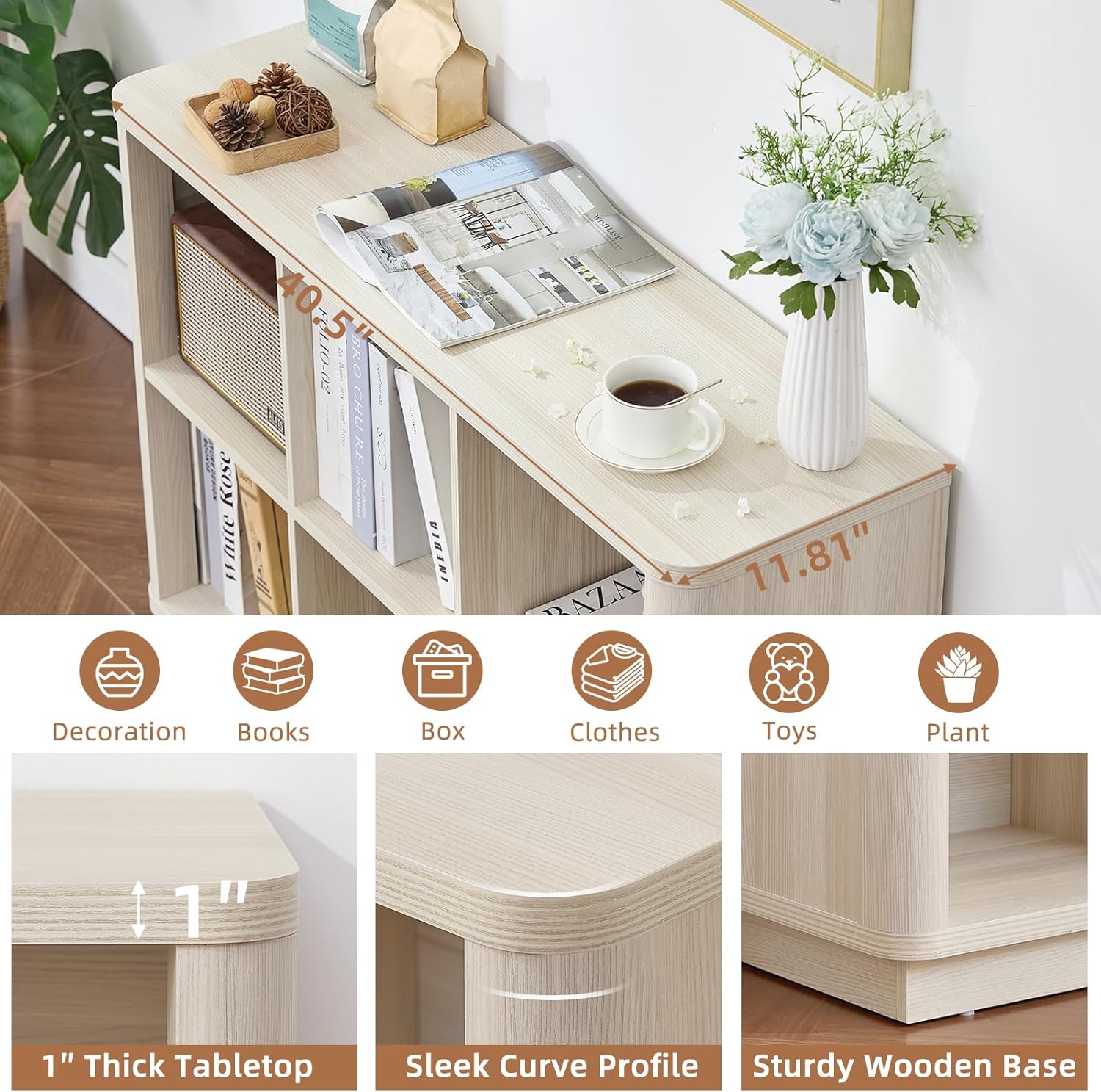 - UNIQUE AESTHETIC DESIGN: This short horizontal bookcase features a minimalist design with chic color palettes and sleek, rounded edges that not only elevate your home aesthetics but also infuse any room with a personalized sense of style. Its unique curvature stands out as a modern centerpiece for your office, playroom, or kids bedroom. Overall size is 40.5(W) x 11.81(D) x 28.6(H) inches.