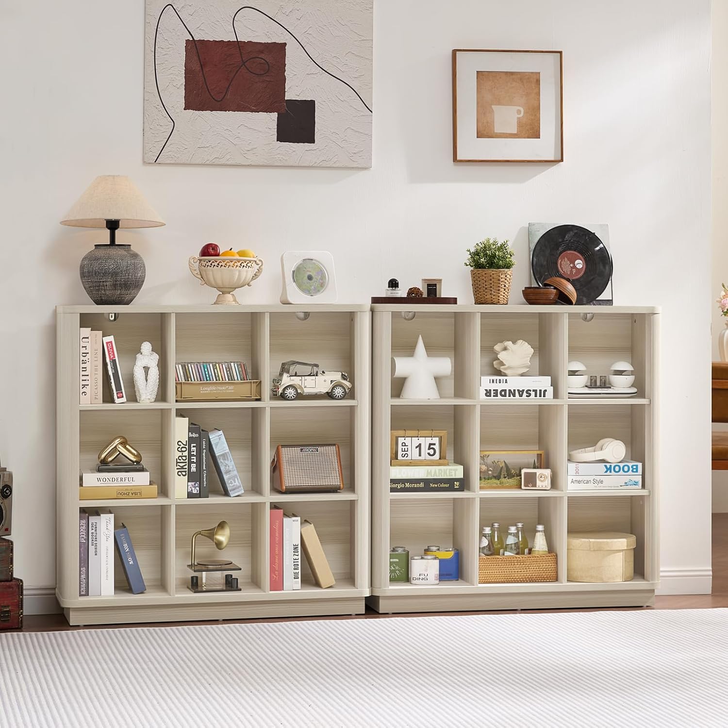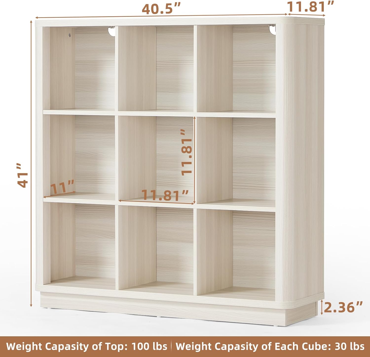 9 Cube Storage Book Shelf, 41" Tall Organizer Bookcase with Curved Edge, Wood Floor Standing 3-Tier Cubby Bookshelf with Base, Vintage Display Book Case for Bedroom, Office, White Cream Oak