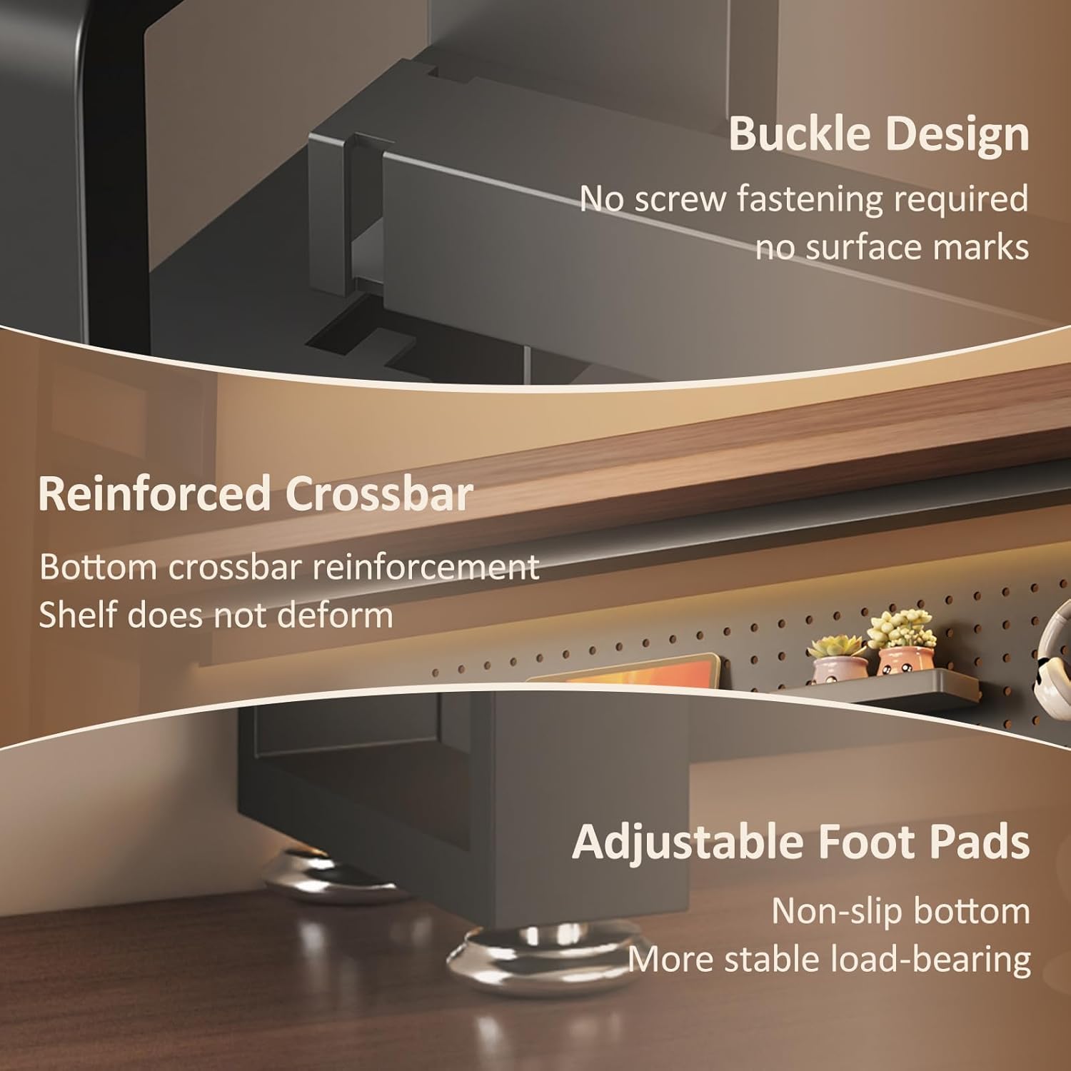 - Thoughtful Design: This desk organizer shelf features adjustable anti-scratch feet to stay stable on uneven surfaces and guardrails to prevent items from falling. This desktop shelf organizer is equipped with a reinforced crossbar, which does not require screws to fix. The buckle design is more stable and load-bearing, making it easier to install.