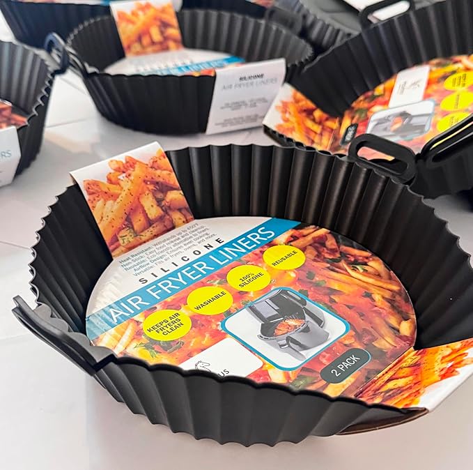 Premium Silicone Air Fryer Liners, Black, 7.87" Top x 6.69" Bottom x 2" Height, Heat-Resistant, Dishwasher Safe, Non-Stick with Handles, 2-Pack